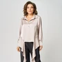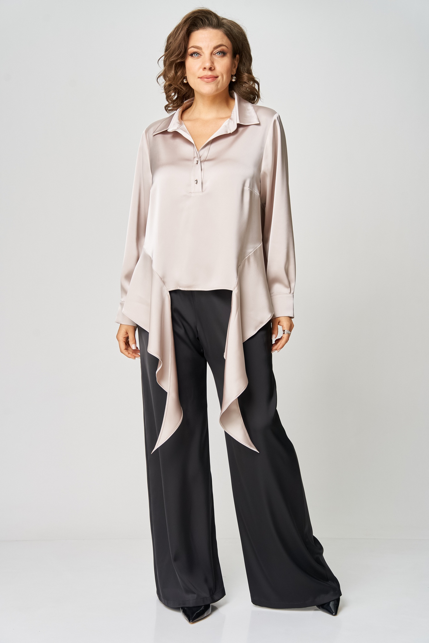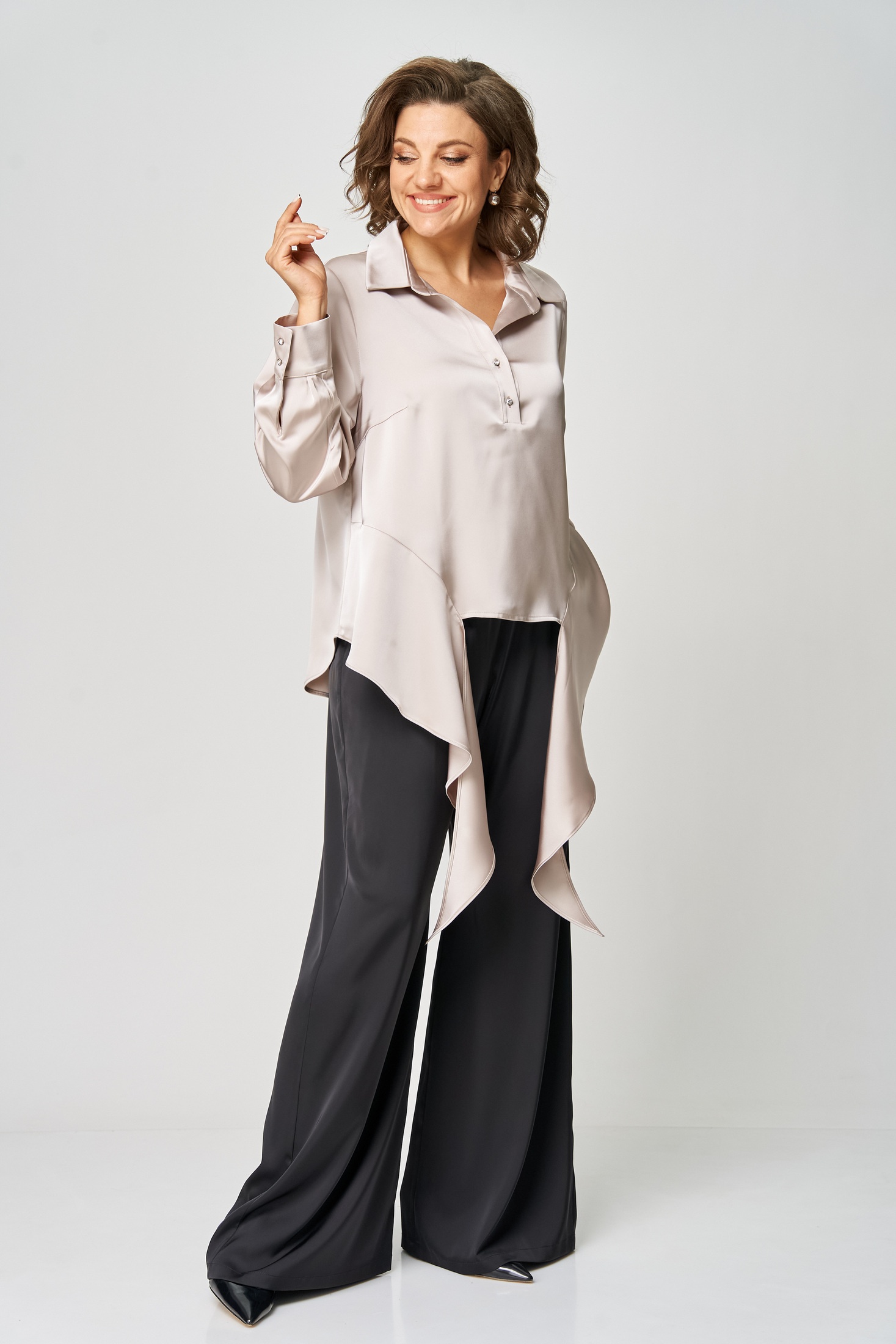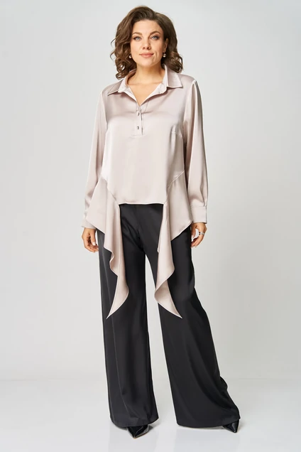 Роскошная двойка состоит из невероятно оригинальной блузки и брюк - палаццо. Наша блузка свободного силуэта средней длины, дополнена планкой по переду. Рукава втачные с естественным положением плеча на манжете. Горловина обработана рубашечным воротником. Пикантно смотрятся на блузке декоративные передние воланы-завязки, придавая образу игривость и кокетливость.