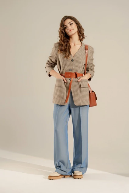 Комплект женский двухпредметный. Жакет на подкладке полуприлегающего силуэта без воротника с V-образным вырезом. Застежка на петли и пуговицы. По переду накладные карманы с декоративными клапанами. Рукав втачной двушовный с имитацией шлицы и отделочными пуговицами. В боковых швах - разрезы. Длина по среднему шву спинки - см, длина рукава- см. Брюки свободные прямые от бедра, в боковых швах карманы с отрезным бочком. Застежка на молнию и петлю с пуговицей. Пояс отрезной с вставкой эластичной тесьмы. Длина с учетом пояса - см. Комплект дополнен съемным поясом. Брюки: ПЭ-80%, Вискоза-16%, спандекс-4%.