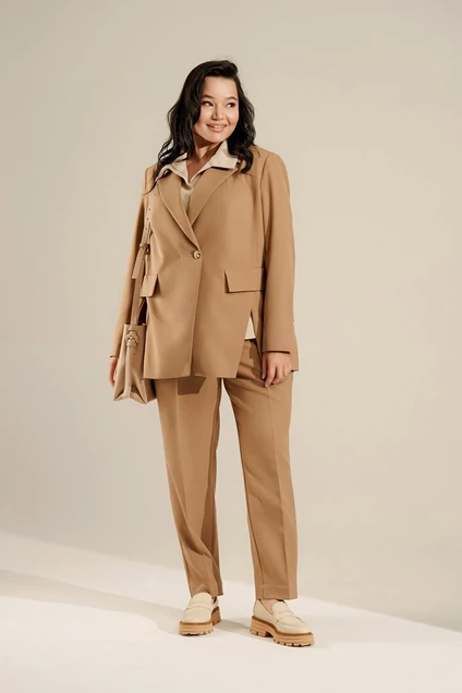 Комплект женский трехпредметный. Жакет прямой двубортный, частично на подкладке. Воротник пиджачного типа, по переду клапаны. Перед и рукава с фантазийной шлицей. Рукав втачной. Длина по среднему шву спинки - см, длина рукава - см. Брюки свободного покроя зауженные к низу. В боковых швах карманы с отрезным бочком. Застежка на молнию и петлю с пуговицей. Пояс отрезной с эластичной тесьмой. Длина с учетом пояса - см. Джемпер полуприлегающего силуэта из трикотажной ткани с воротником "поло" и длинным втачным рукавом. Длина по спинке - см, длина рукава - см. Блуза : Вискоза-65%, нейлон-30%, спандекс-5%