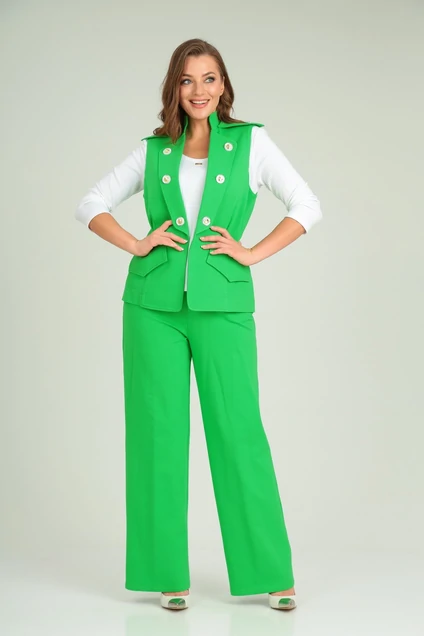 Комплект брючный(жилетка +блузон+брюки). Жилетка полуприлегающего силуэта без застёжки с открытыми лацканами, воротник стойка. Спинка со редним швом и рельефнвыми швами. Перед рельефные швы, настрочные клапаны. В качестве отделки используется отделочная строчка и фурнитура. Брюки прямые свободного кроя , верхний срез обработан поясом с резинкой, в боковых швах карманы.. Блузон полуприлегающего силуэта, рукав втачной одношовный ,горловина обработана бейкой. Длинапо спинке жилетка 62 см. ,длина по спинке блузон 60 см., длина рукава 46см., длина брюк 106 см.