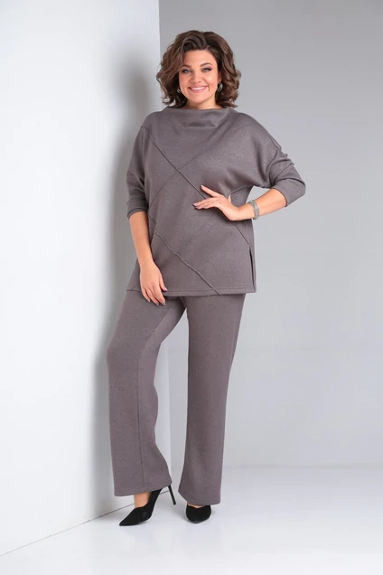Комплект брючный, состоящий из джемпера и брюк, выполнен из трикотажного полотна. Джемпер свободного кроя. Перед украшен защипами в виде ромбов. Рукав втачной, одношовный со спущенной линией плеча. Горловина лодочка с мягким заворотом припуска внутрь. По бокам обработаны разрезы. Брюки прямые свободного кроя без бокового шва. Пояс цельнокройный на резинке. Длина кофты по спинке 73 см.,длина рукава 59-61 см. Длина брюк 106 см