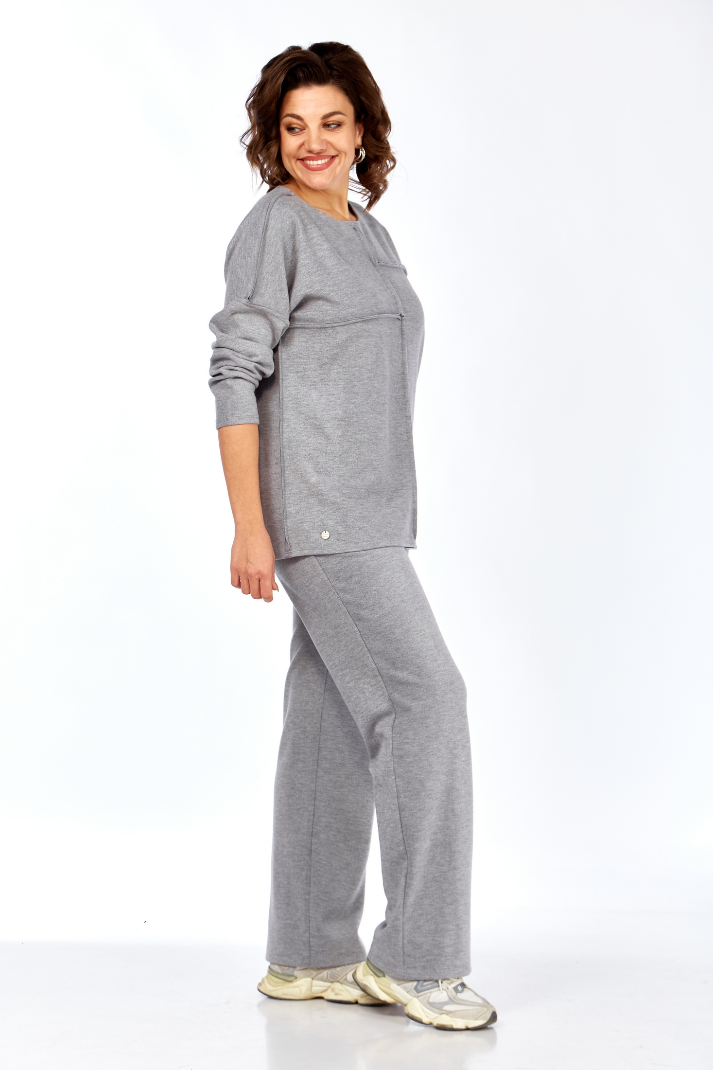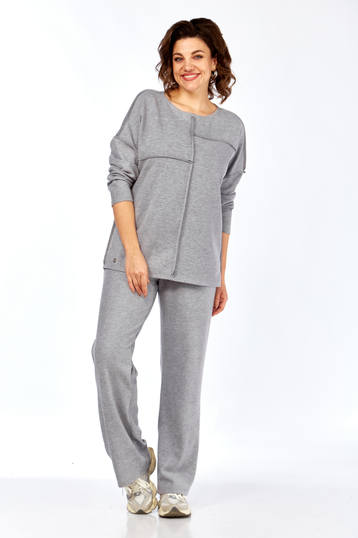 Комплект брючный : джемпер и брюки из трикотажного полотна. Джемпер с разрезными на 4 части передом и спинкой,швы обработаны припусками на лицо. Горловина округллой формы обработана распошивочным швом. Низ рукава и изделия тоже обработаны распошивочным швом. Брюки прямые. Цельнокроенный пояс на резинке.