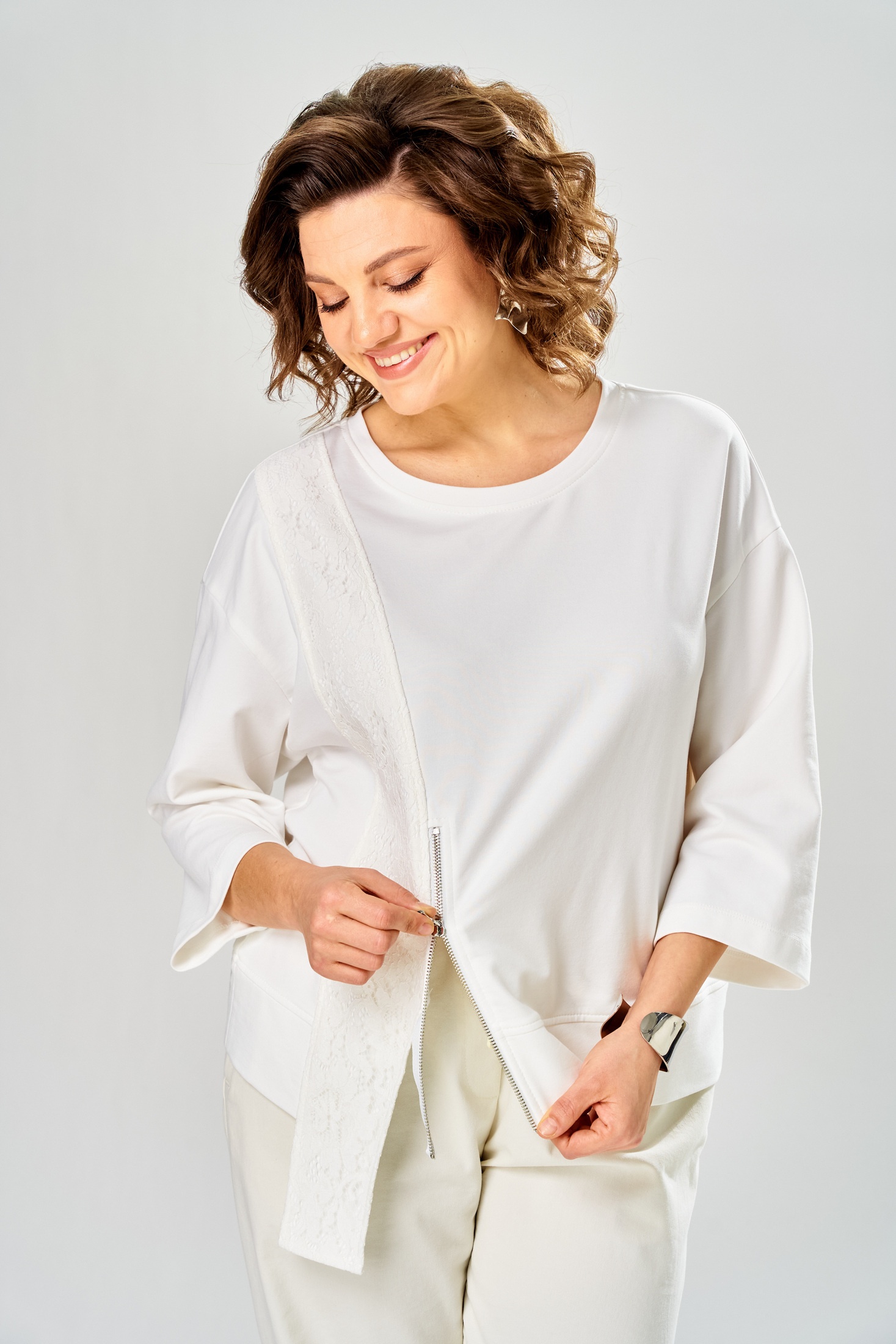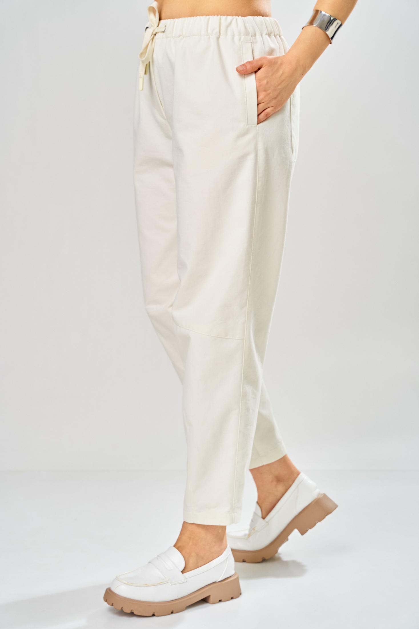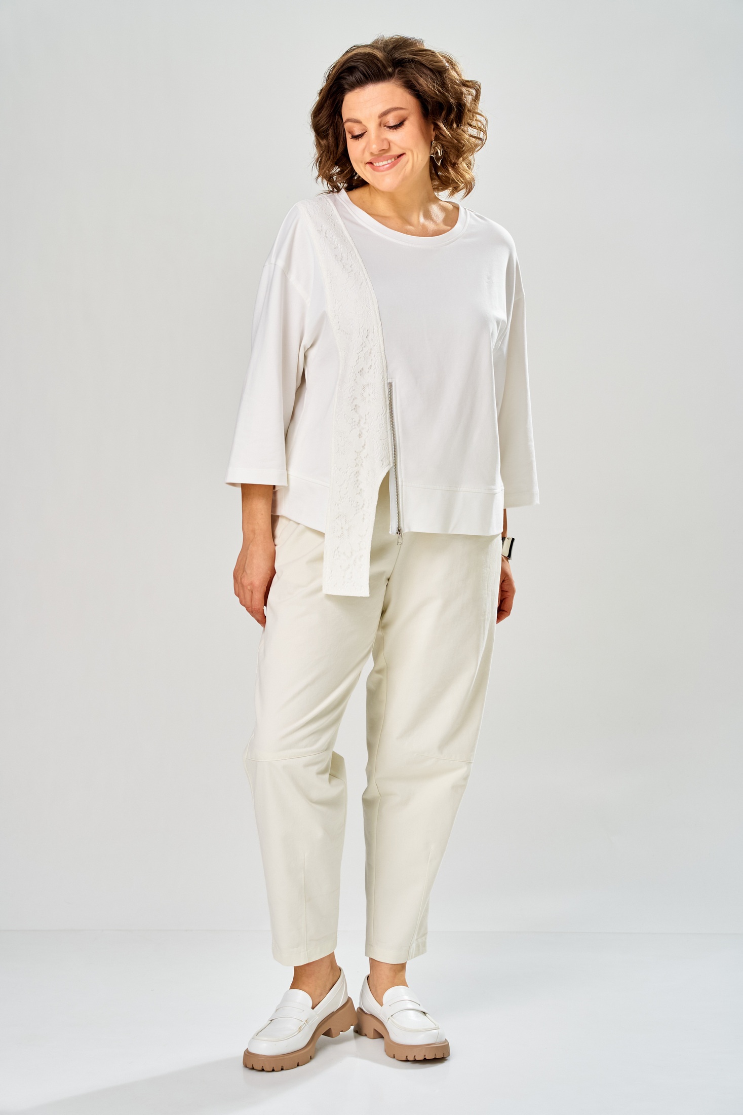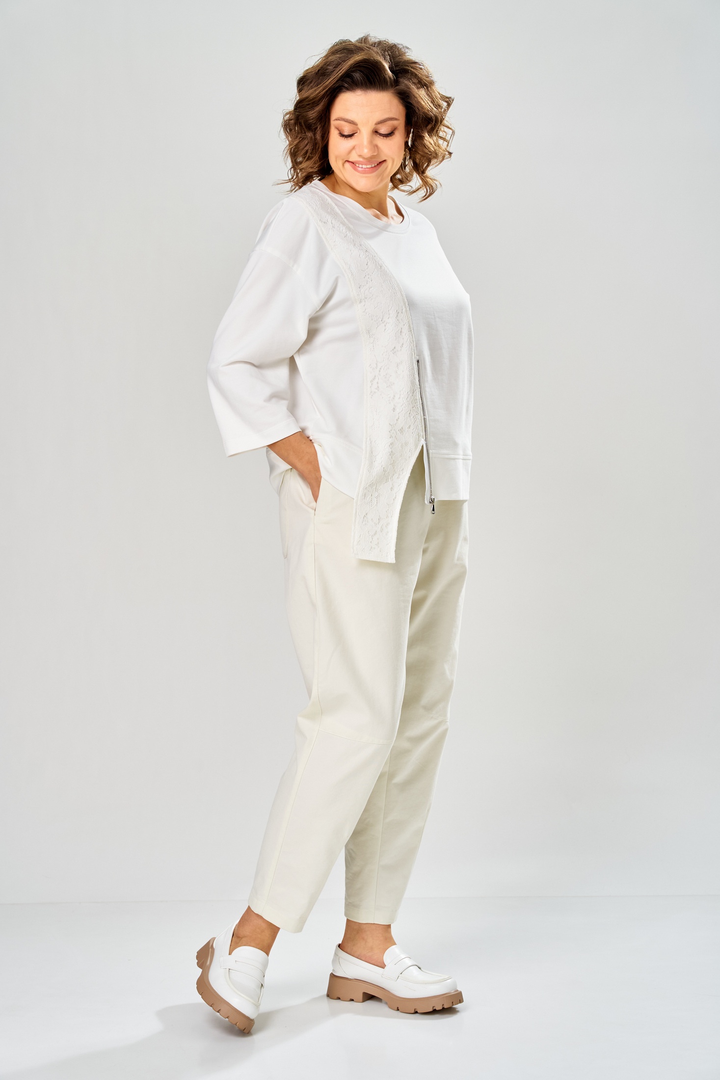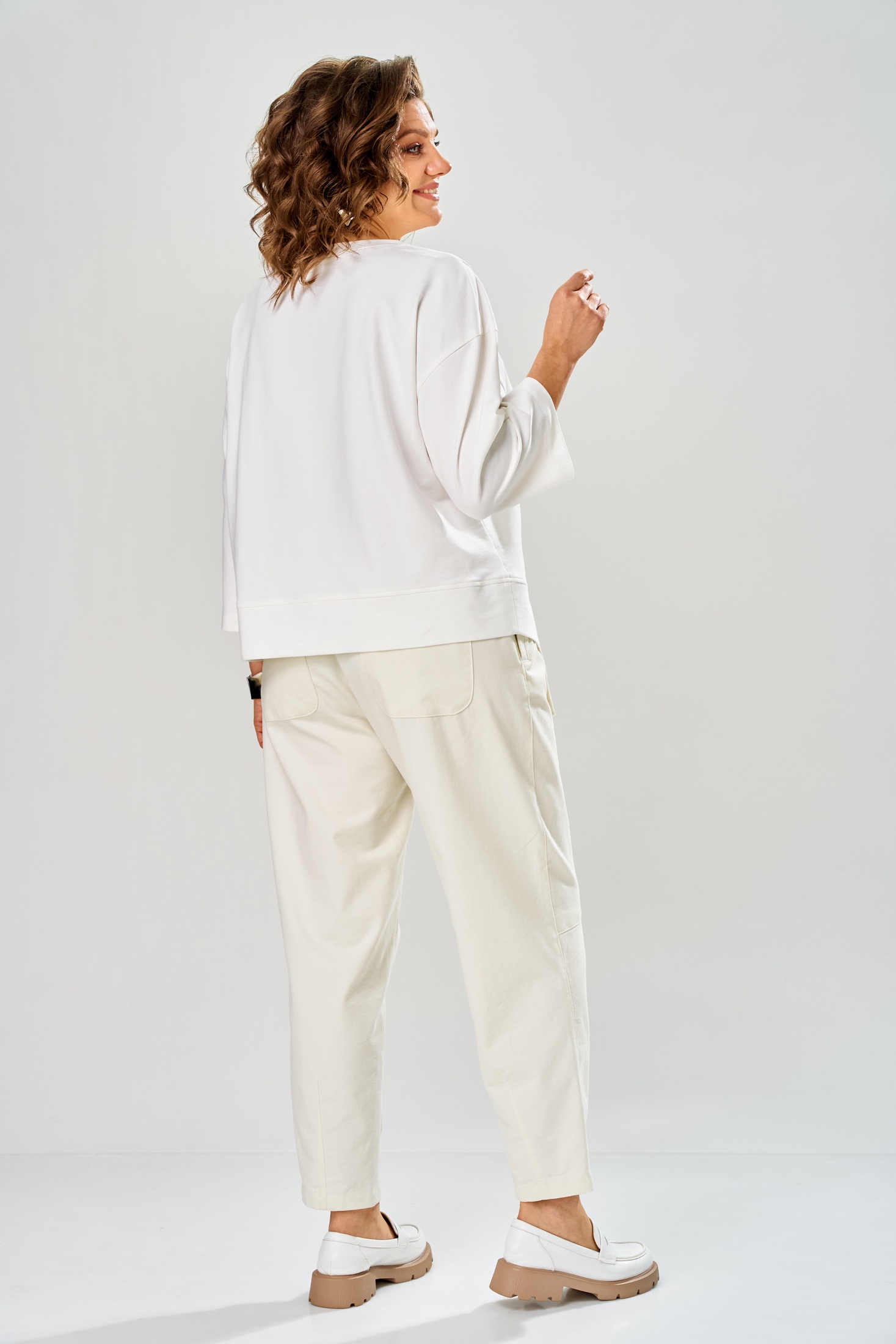 Костюм брючный 2160 молочный Diamant сочетает в себе комфорт и стиль, предлагая универсальное решение для повседневного гардероба. Коллекция бренда Diamant представляет этот изящный комплект, выполненный из мягкого хлопка с добавлением полиэстера и лайкры, что обеспечивает приятные тактильные ощущения и долговечность. Свободная кофта со спущенным плечом и укороченными рукавами подчеркивает современный крой, а молния по спинке добавляет удобство в ношении. Брюки зауженного силуэта с карманами и резинкой на поясе гарантируют оптимальную посадку. Этот молочно-белый костюм идеален для весенне-летних прогулок благодаря своей легкости и дыхательным свойствам. Длина кофты по спинке составляет 56 см, длина рукава — 37 см, а брюки имеют общую длину 96 см.