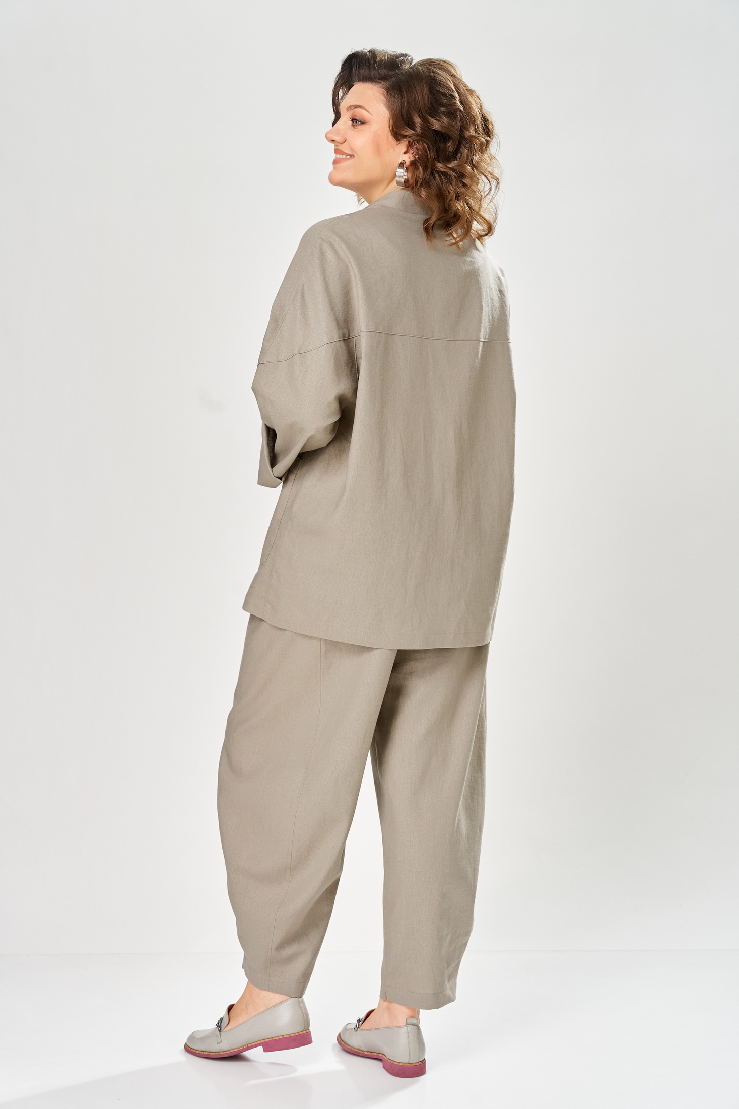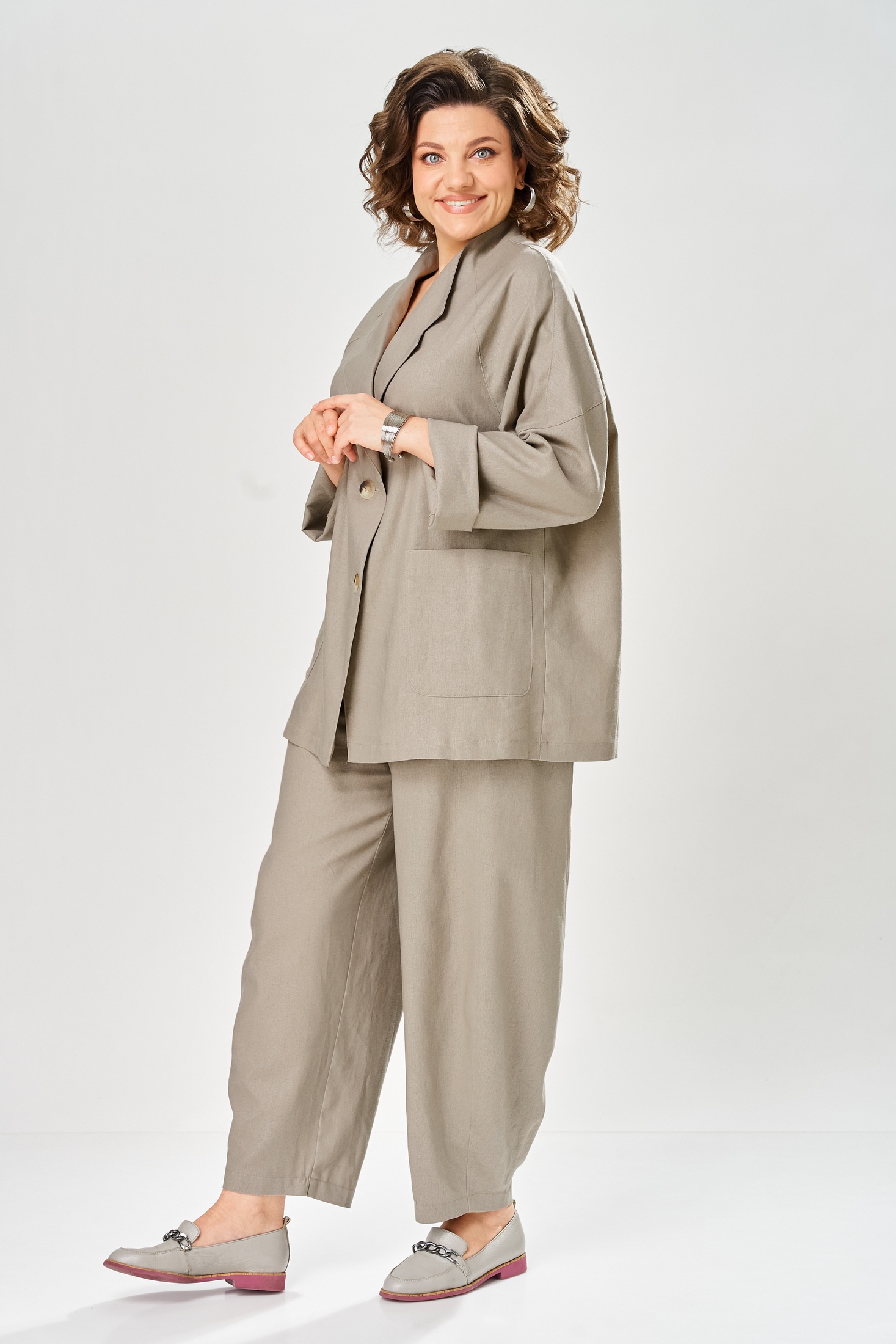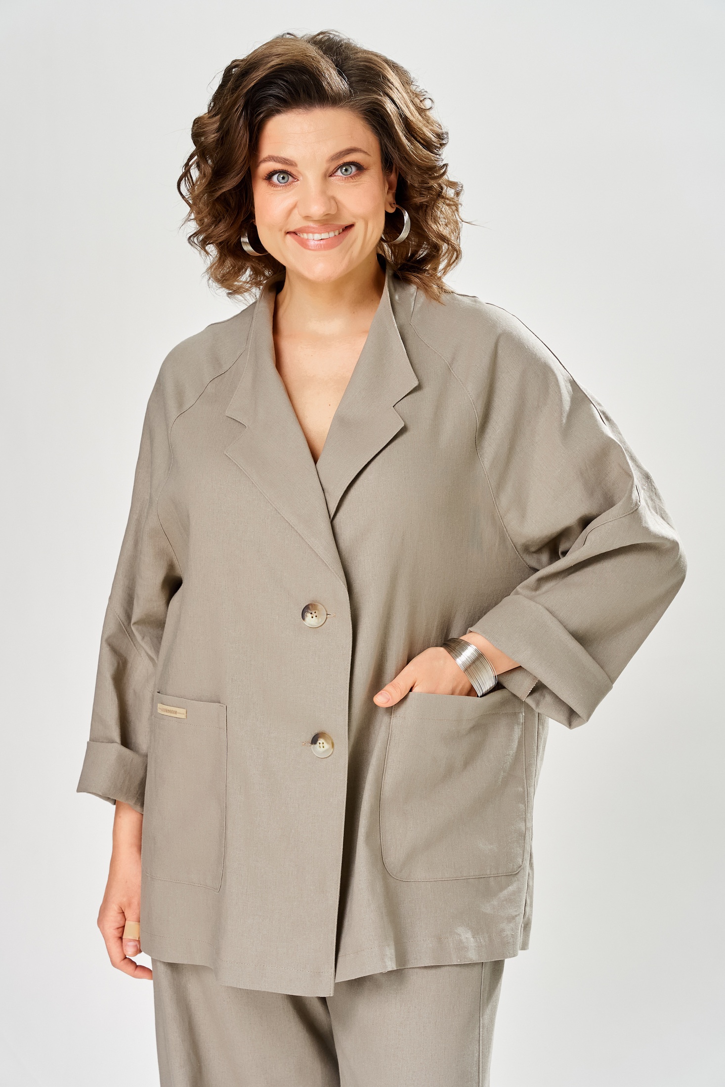 Костюм брючный 2168 бежевый Diamant — идеальный выбор для повседневного офисного стиля. Коллекция бренда Diamant выполнена из комбинации льна и вискозы, обеспечивающих комфорт и легкость. Жакет прямого силуэта с застежкой на две пуговицы и отворотом с лацканами подчеркивает современный стиль. Боковые накладные карманы и декор-нашивка добавляют практичности и уникальности. Брюки свободного фасона с отрезными боками и застежкой на молнию удобны в носке. Пояс с частичной резинкой и шлевками для комфортной посадки. Этот костюм подходит для весенне-летнего сезона, подчеркнет вашу индивидуальность и утонченность. Стильный бежевый цвет прекрасно сочетается с разнообразными аксессуарами. Длина по спинке жакета составляет 74 см, а общая длина комплекта — 104 см.