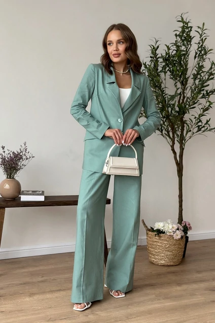 Жакет с центрально-бортовой застежкой на 2 петли и пуговицы. Перед с нагрудными вытачками из бокового шва и наклонными рельефами, заканчивающимися на уровне кармана «в рамку». Ниже параллельно карману настрочен клапан.