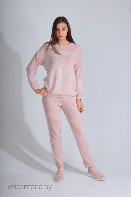 Брюки прямые , верхний срез обработан поясом с резинкой , по низу притачные манжеты. По боковым швам передней и задней половинки -лампас из отделочной ткани. В рельефных швах передней половинки обработаны карманы. Длина по спинке блузона 65 см.,длина рукава с манжетом 66 см.,длина брюк по бокоовому шву 109 см.