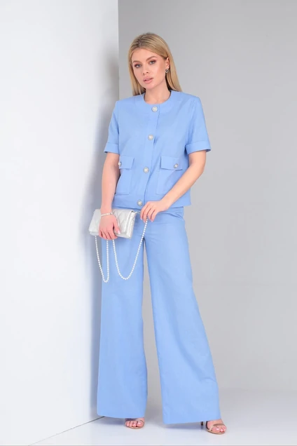 Стильный летний костюм в стиле "ШАНЕЛЬ", из натуральной льняной ткани. Жакет с коротким рукавом с планкой. По полочкам накладные карманы, застежка на пуговицы. Брюки высокой посадки на молнии в боковом шве, без пояса, расширены от бедра. Длина жакета 42-44 - 54 см, 46-48 - 56 см. Длина рукава 42-44 - 25 см, 46-48 - 26 см. Длина брюк 110 см.