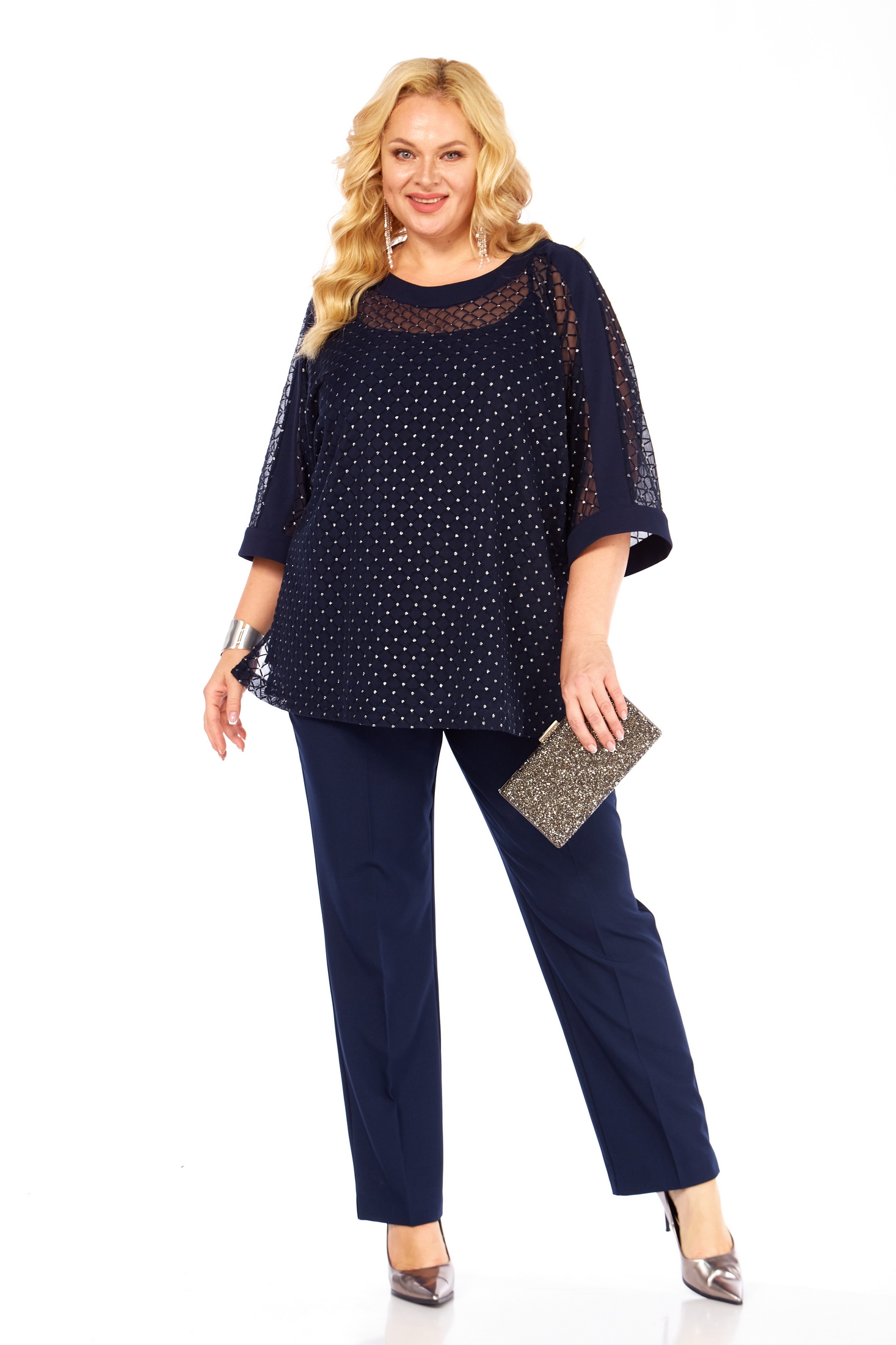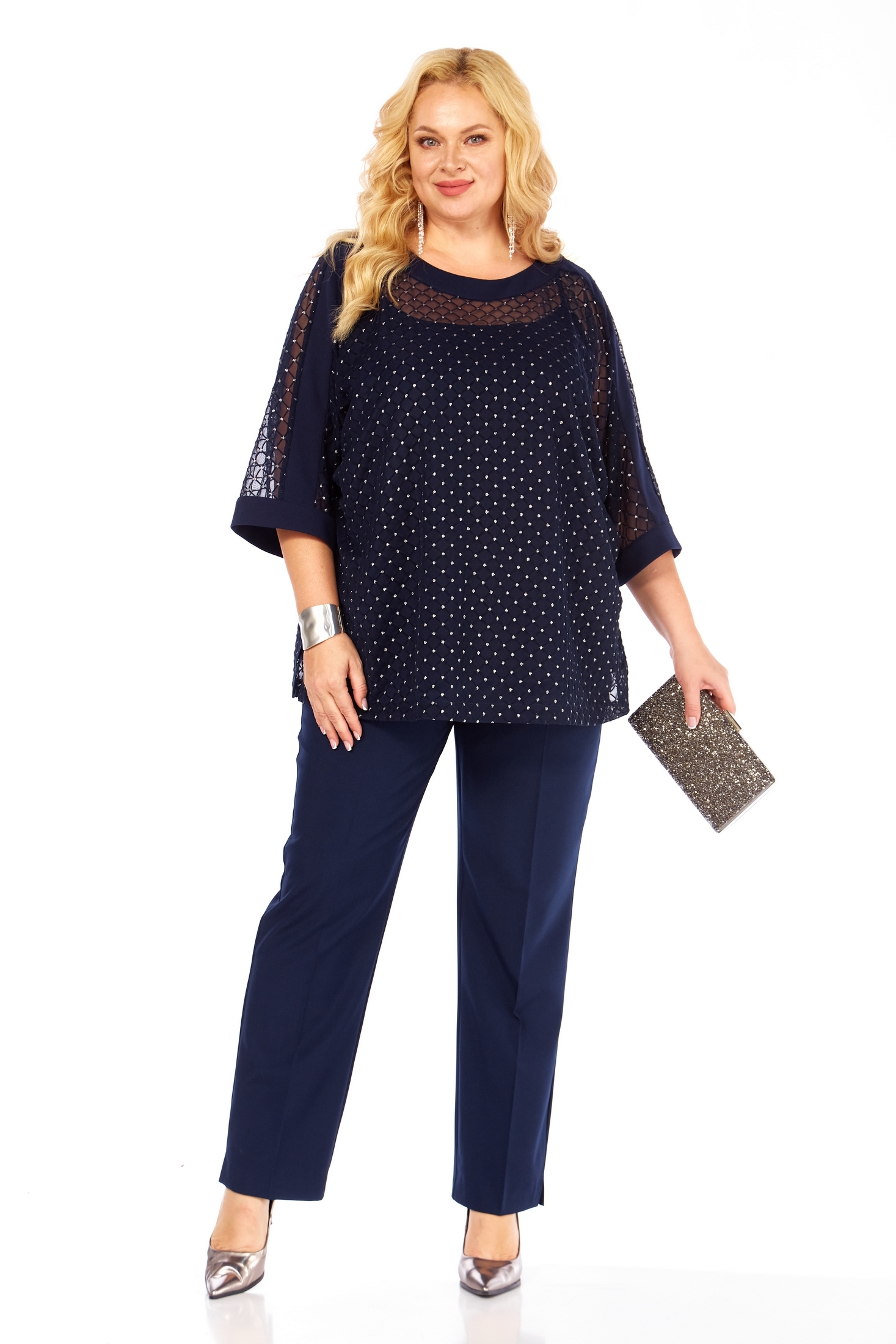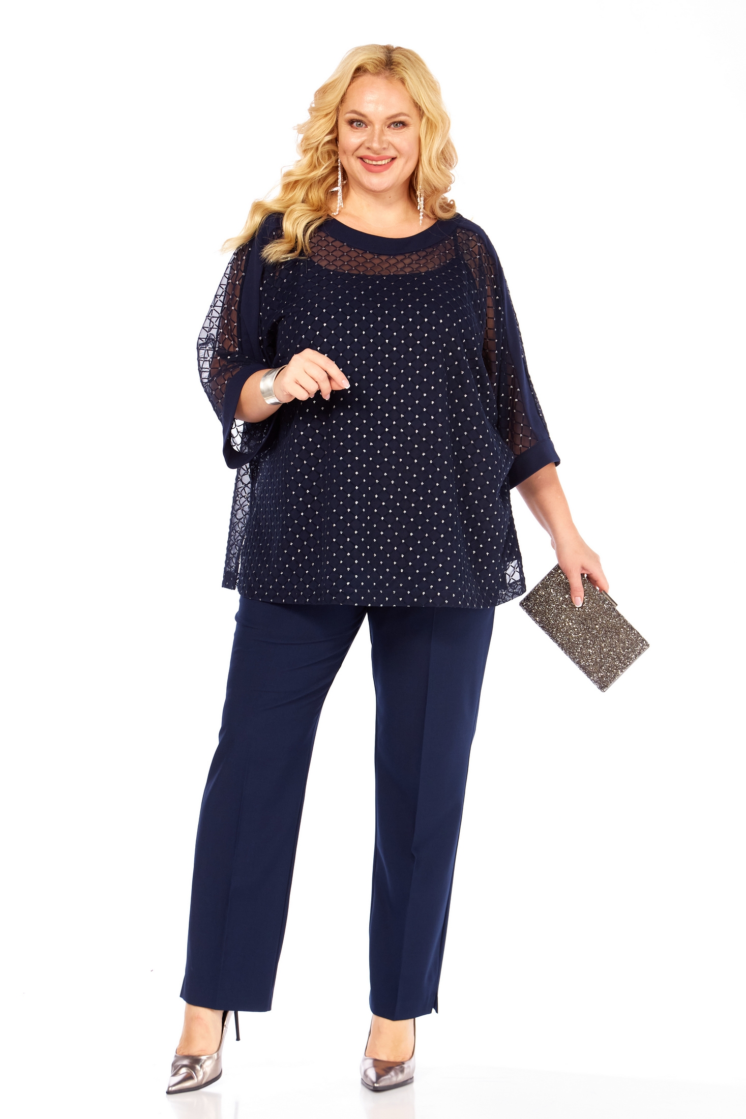 Костюм брючный 2420 темно-синий Элль-стиль — идеальный выбор для вечерних мероприятий. Коллекция бренда Элль-стиль предлагает тройку из блузки, топа и брюк. Блузка выполнена из 100% полиэстера, имеет округлую горловину и рукава 7/8 с разрезами. Топ из вискозы и полиэстера придаёт комплекту мягкость и комфорт. Брюки классического фасона с заутюженными стрелками подчеркнут стильный образ. Застёжка на молнию и пуговицу добавляет удобства. Темно-синий цвет костюма добавит шарма вашему наряду, а сочетание материалов делает его идеальным для праздничного сезона и торжественных выходов.