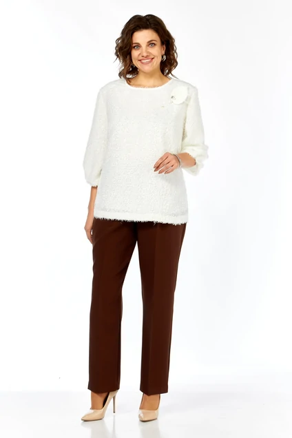 Комплект женский брючный 2-х предметный. Праздничная элегантная блузка полуприлегающего силуэта, выглядит эффектно, прекрасно подойдет для мероприятий. Горловина аккуратной округлой формы. Рукав втачной, свободный с фантазийным решение, длина 7/8. Декоративным элементом является съемная дизайнерская брошь. Средний шов спинки вверху переходит в застежку на 6 навесных петель, пуговиц. В боковых швах предусмотрены разрезы. Брюки классические с заутюженными стрелками, слегка зауженные к низу, оформлены притачным поясом, частично на резинке. Застежка спереди брюк на молнию и петлю-пуговицу.