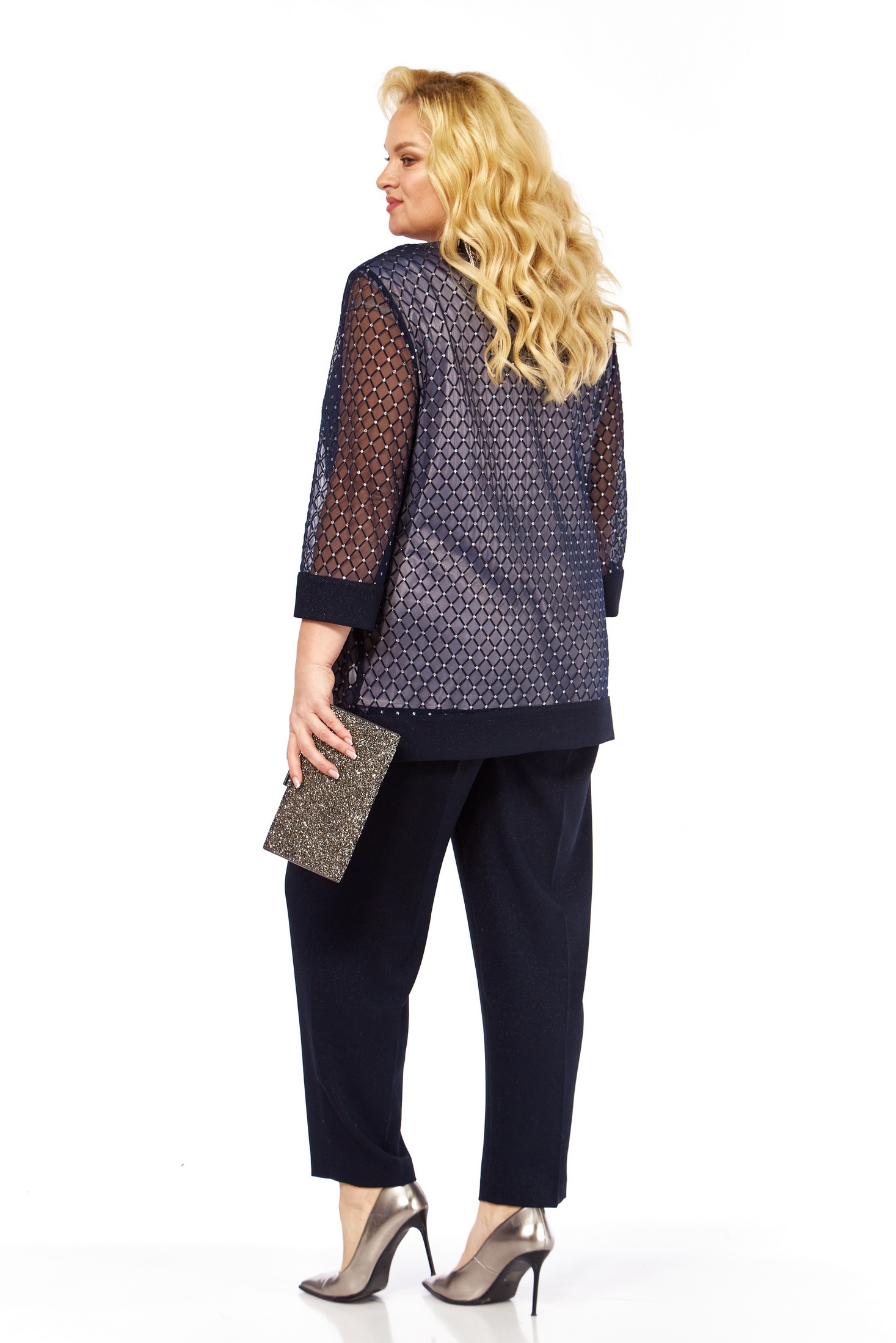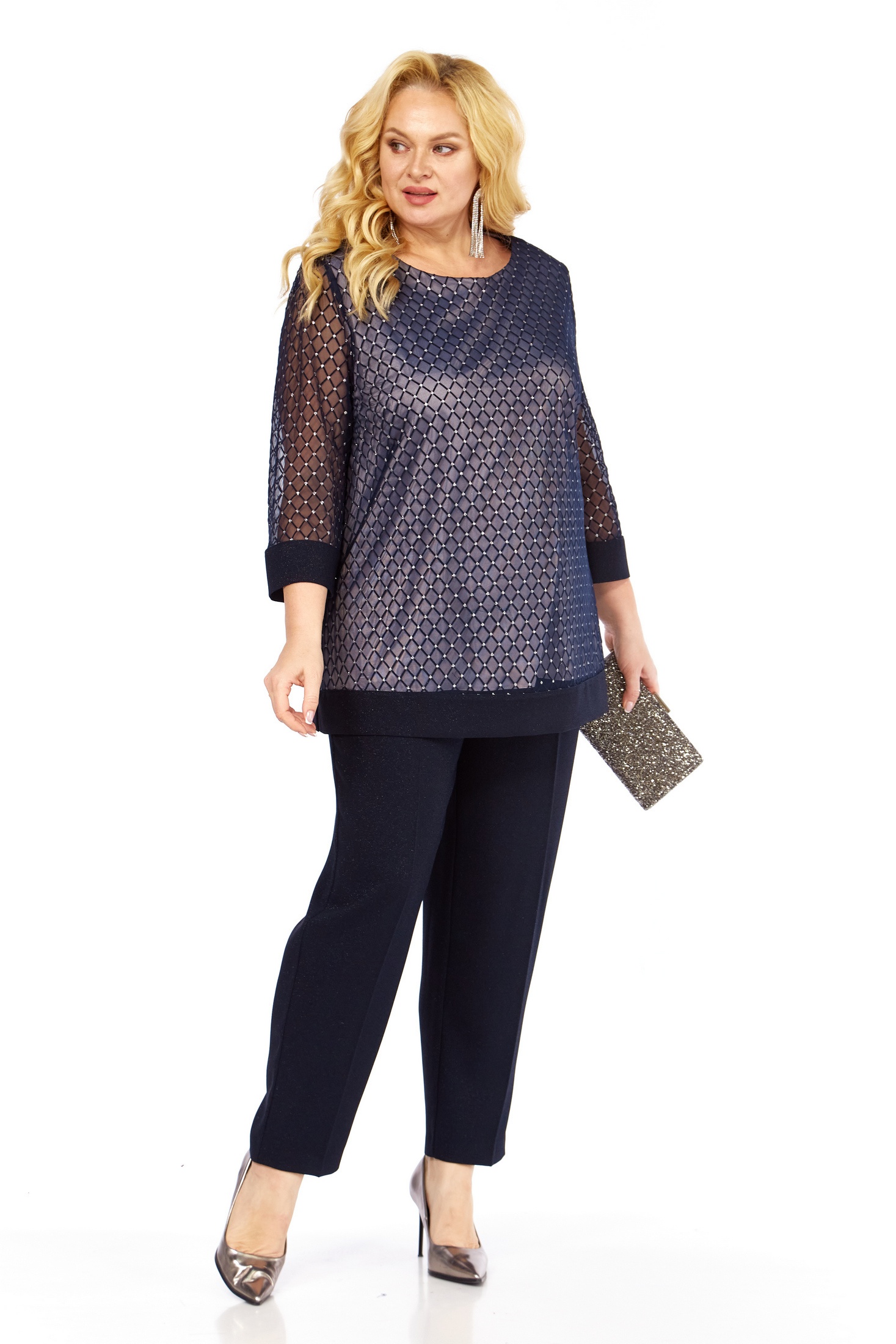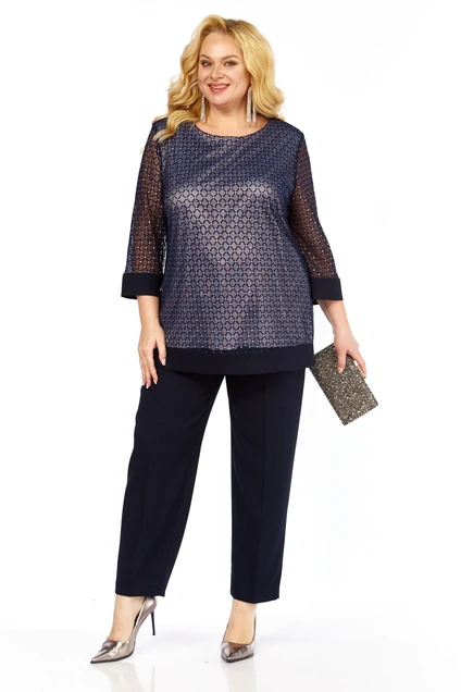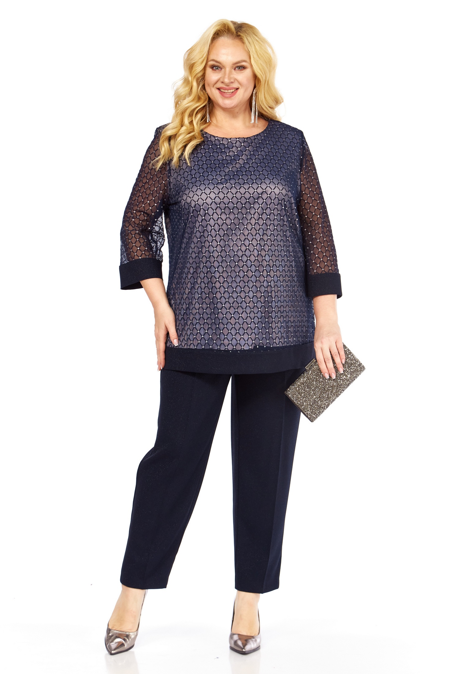 В таком наряде женщина будет выглядеть элегантно, празднично на любом событие. Комплект 2-ух предметный, состоит из блузки и брюк. Блузка полуприлегающего силуэта выполнена из легкого шифона с дизайнерским флоком на контрастной подкладке. Горловина округлой формы. Полочка с нагрудными вытачками. Рукав втачной, свободный 7/8. В боковых швах предусмотрены разрезы. Брюки выполнены из ткани с легким элегантным мерцанием, слегка зауженные к низу. Пояс притачной, частично на резинке. Застежка спереди на тесьму-молнию, петлю-пуговицу.