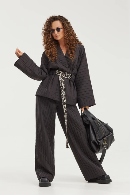 Костюм женский, состоящий из жакета в стиле "кимоно" и брюк. Комплект выполнен в ткани, имитирующей "стежку". Жакет прямого силуэта. По переду и спинке широкие шлёвки и съёмный пояс из декоративной тесьмы с пряжкой, что позволяет регулировать величину объемов. Горловина и край борта с притачной планкой. Рукав цельнокроеный, заканчивающийся притачной манжетой. Брюки прямого силуэта. По переду карманы. Пояс притачной, с застежкой на петли, пуговицы и молнию. По задней части пояса резинка.