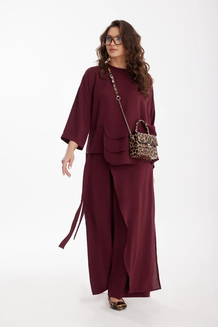 Комплект женский, состоящий из туники и брюк. Туника прямого силуэта, со спущенной линией плеча. Рукав втачной, одношёвный, длиной 3/4. Вырез горловины круглый. Перед с нагрудными вытачкамии фирменным пришивным элементом. Горизонтальный подрез по низу. По правому боку туники декоративные элементы в виде лепестков. Брюки прямого силуэта. Пояс притачной с резинкой. Брюки декорированы отлетным элементом, в виде юбки на запах, завязывающимся по переду. В боковых швах карманы.