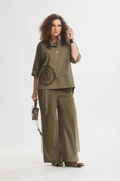 Комплект женский, состоящий из блузы и брюк. Блуза из двух видов ткани, прямого силуэта, "оверсайз", с цельнокроеным рукавом, заканчивающимся притачной манжетой, с возможностью отворота. Воротник - стойка. Спинка с отрезной кокеткой из сетки, нижняя часть спинки на запах. Низ спинки фигурный. Перед с притачной горизонтальной планкой по низу, разрезами в боковых швах и втачной планкой по горловине, застёгивающейся на кнопки. Блуза декорирована настрочными элементами из сетки, в виде цветов. Брюки прямого силуэта, с декоративными отлетными элементами из сетки и хлястиками, застёгивающимися на кнопку, по переду. Брюки на притачном поясе с резинкой. В боковых швах карманы.