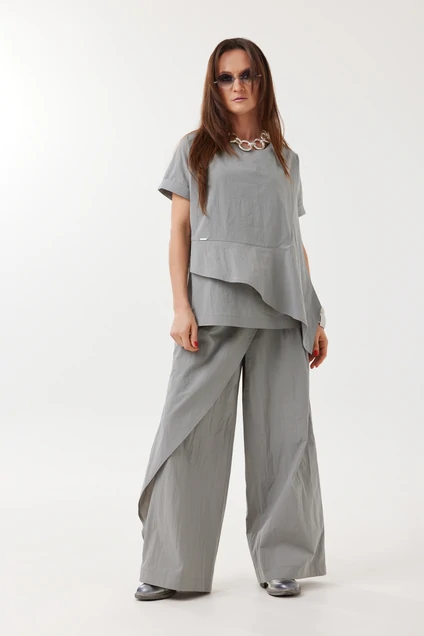 Комплект женский, состоящий из туники и брюк. Туника прямого силуэта, со спущенной линией плеча и притачной манжетой. Горловина - лодочка. Перед с фигурным подрезом и отлетным декоративным элементом. Спинка со средним швом. Брюки прямого силуэта. Пояс притачной, с резинкой по задней части. Застёжка на молнию, петлю и пуговицу. Перед с боковыми карманами и складками. Правая часть переда с отлетным декоративным элементом, застёгивающимся на потайную петлю и пуговицу.