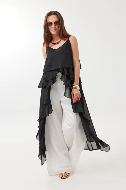 Комплект женский, состоящий из туники и брюк. Туника А-силуэта, на бретелях с регуляторами длины. По переду подрезы, воланы. Спинка со сборкой и воланом. Брюки типа "палаццо", на хлопковой подкладке. Передняя часть брюк со складками. Пояс притачной, с резинкой по боковым и задней частям.