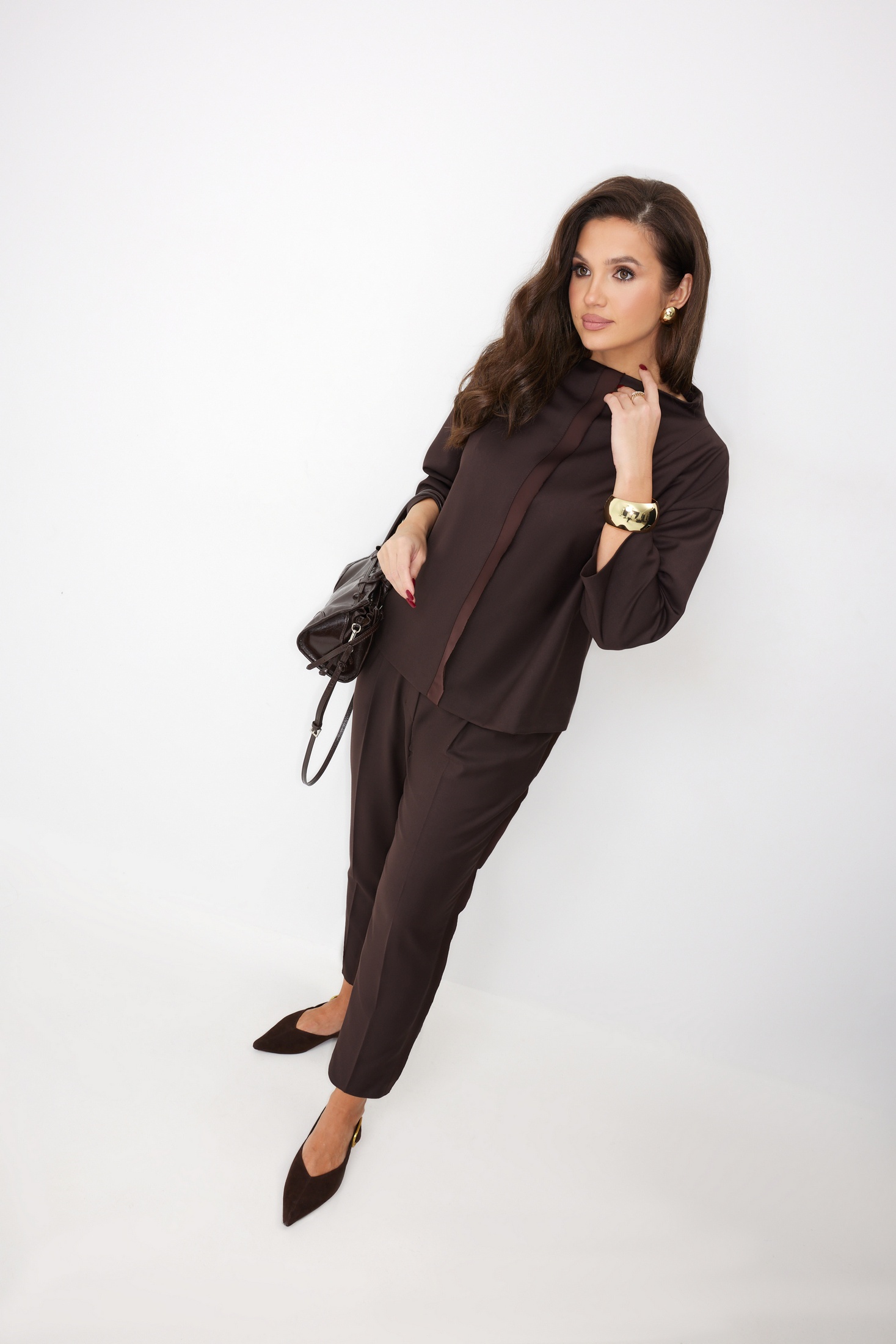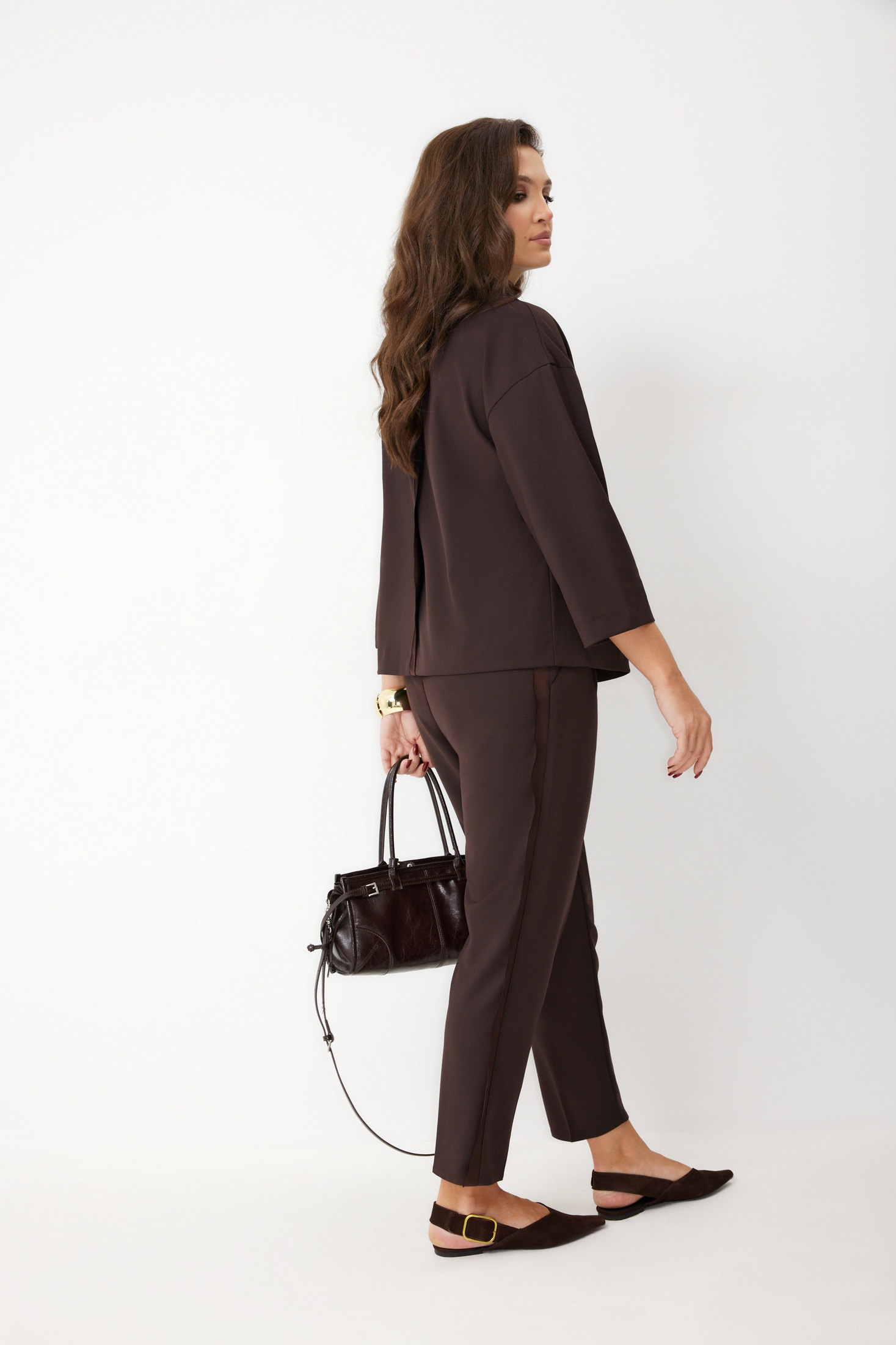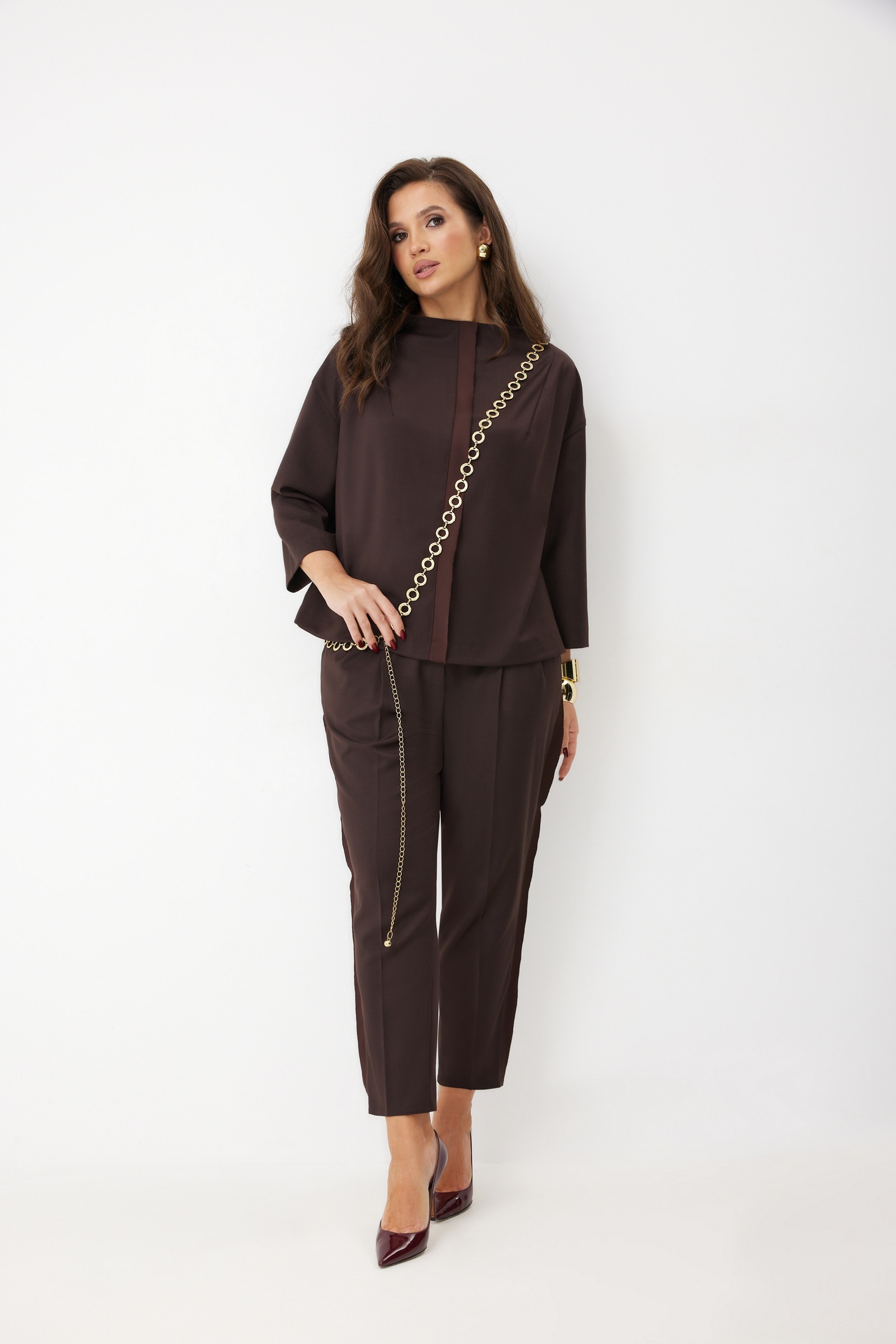 Комплект женский, состоящий из блузы и брюк. Блуза прямого силуэта. По переду и спинке подрез с деталью из отделочной ткани. Воротник - цельнокроеная стойка с расширенной горловиной. По переду вытачки. Линия плеча спущена, рукав втачной, в боковых швах разрезы. Брюки прямого зауженного к низу силуэта. Передняя часть с боковыми карманами. По задней части вытачки. В боковых швах лампасы из отделочной ткани. Застежка на молнию, петли и пуговицы. Пояс притачной, со шлевками и с резинкой по боковым и задней части.