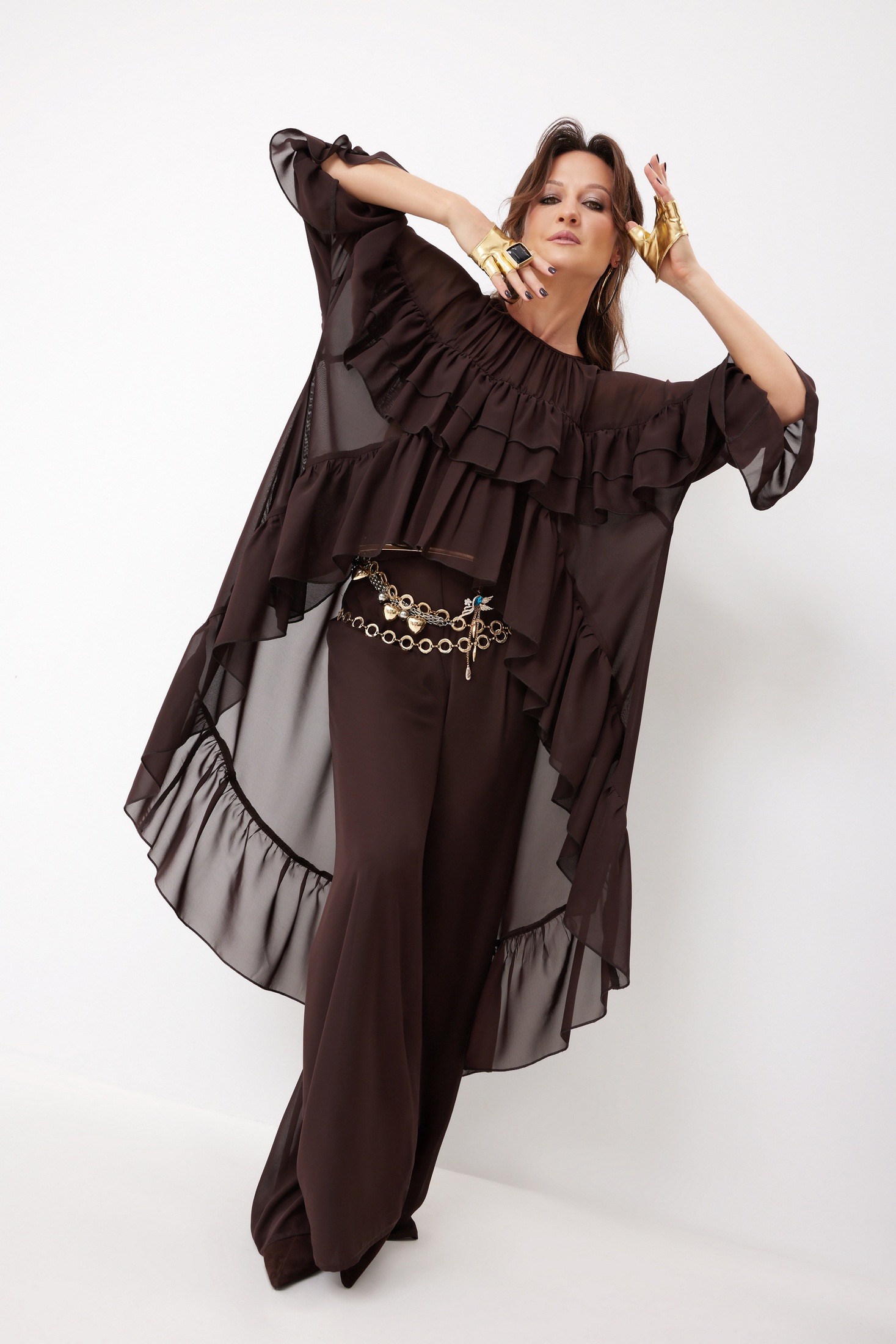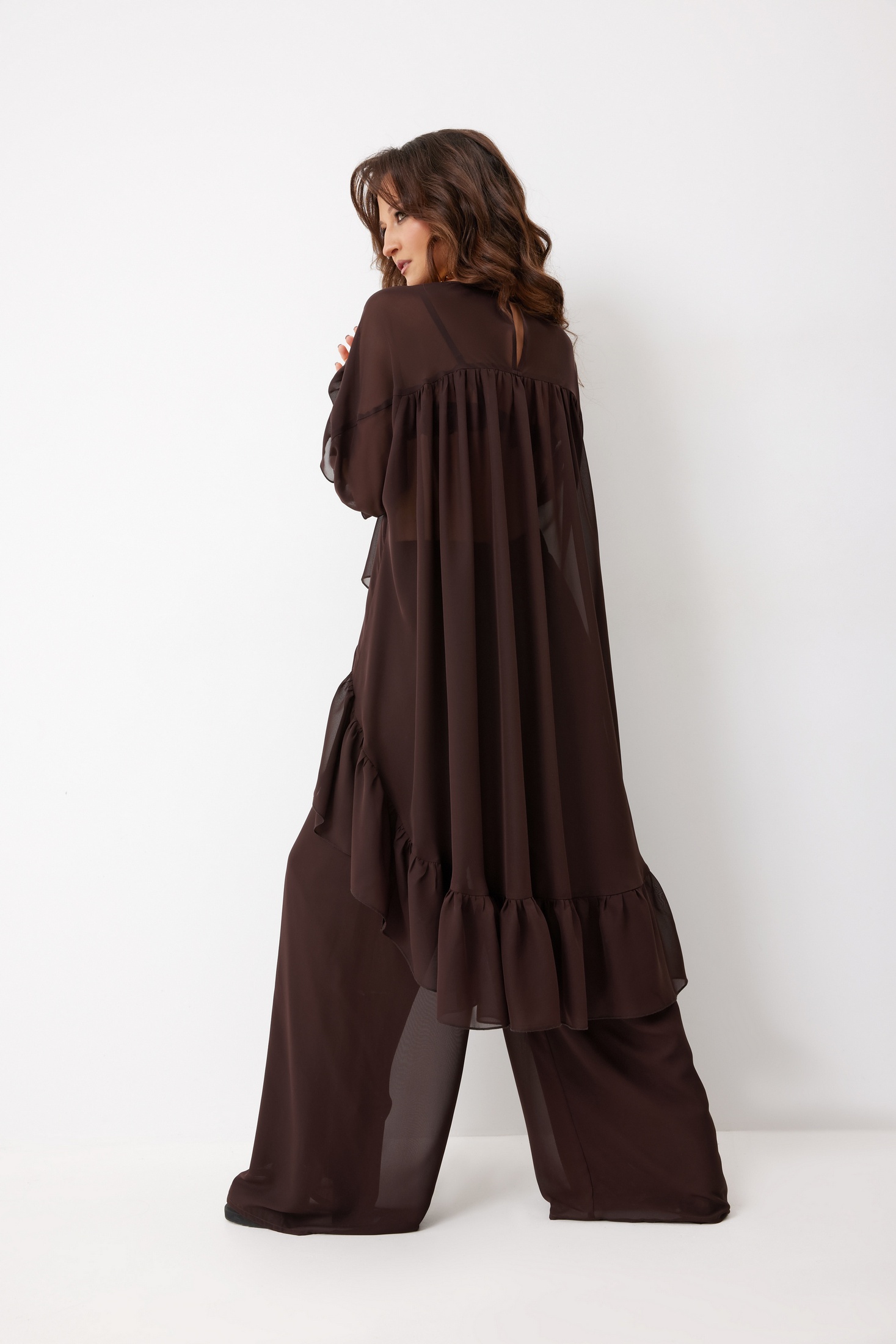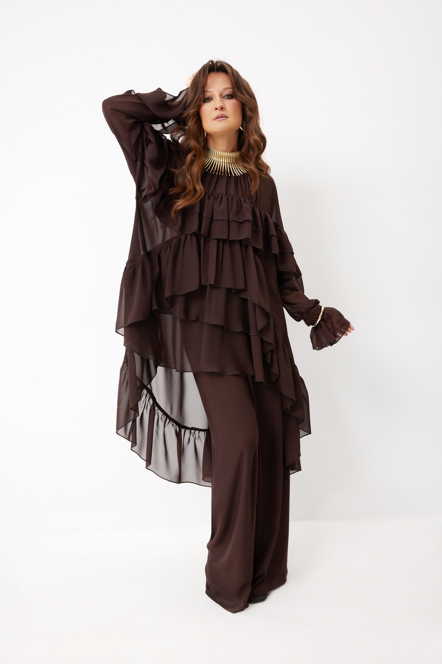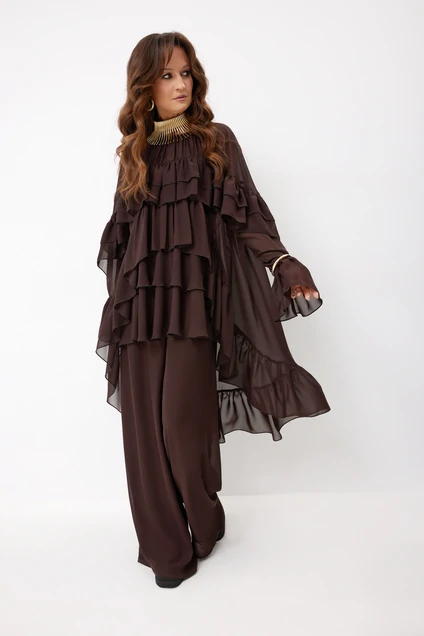 Комплект женский, состоящий из туники и брюк. Туника А-образного силуэта. По переду и спинке подрезы с воланами, рюшами и сборками. Рукав длинный, цельнокроеный с воланом. По низу рукава резинка. Горловина круглая, с застежкой в среднем шве спинки на петлю и пуговицу. Низ туники разноуровневый. Брюки "палаццо", на подкладке. Пояс притачной , с резинкой по боковым и задней частям.