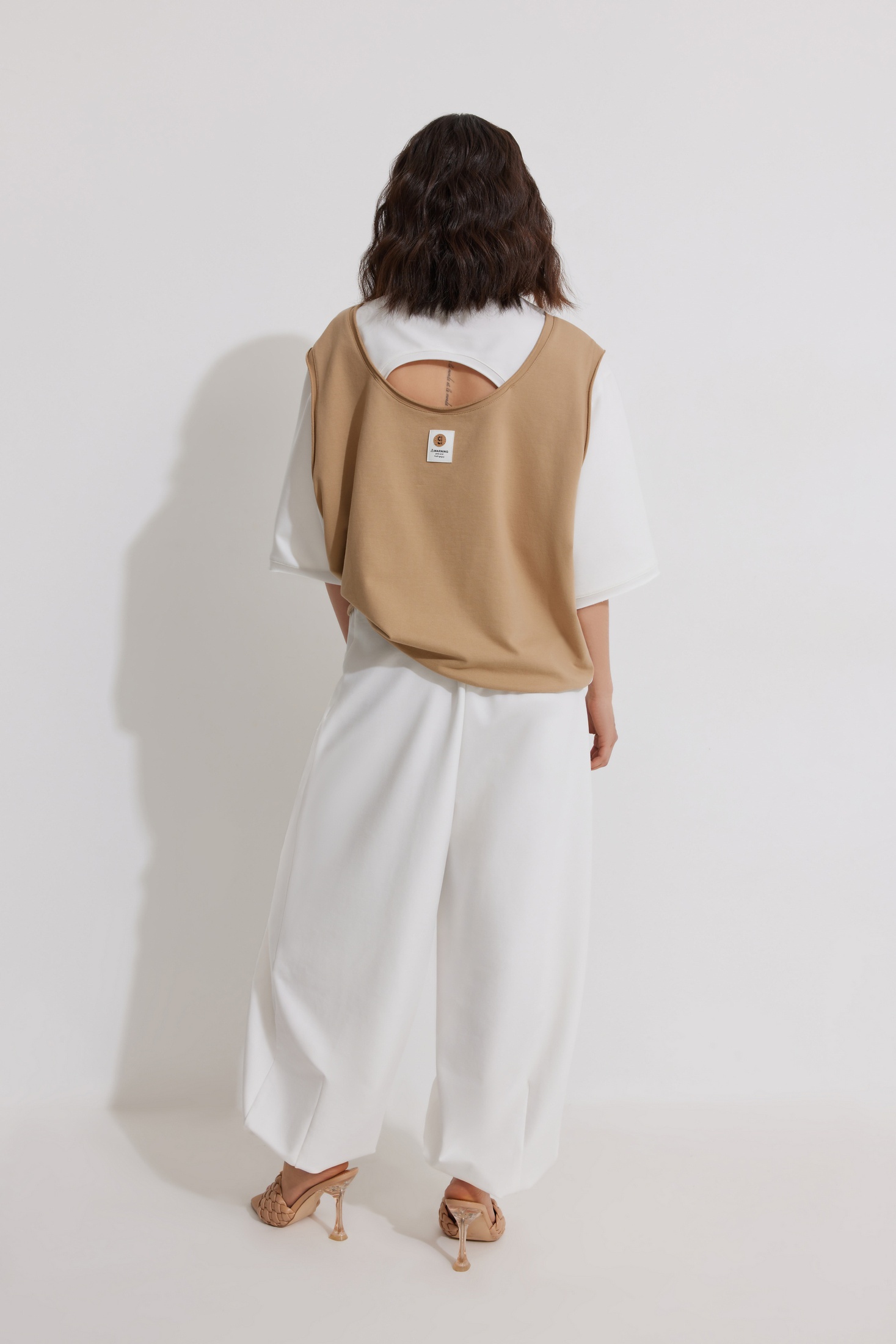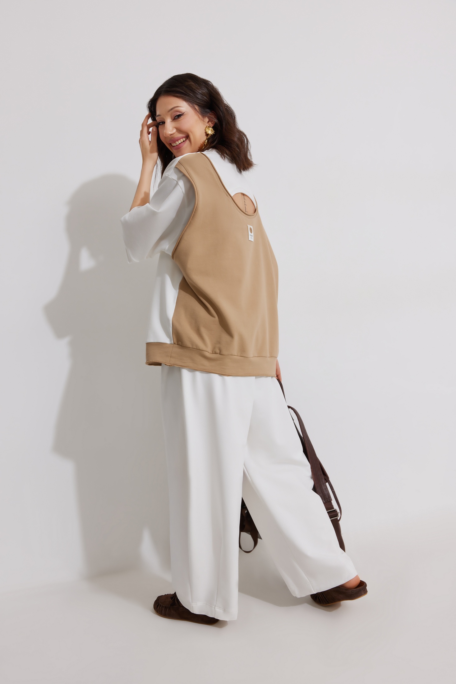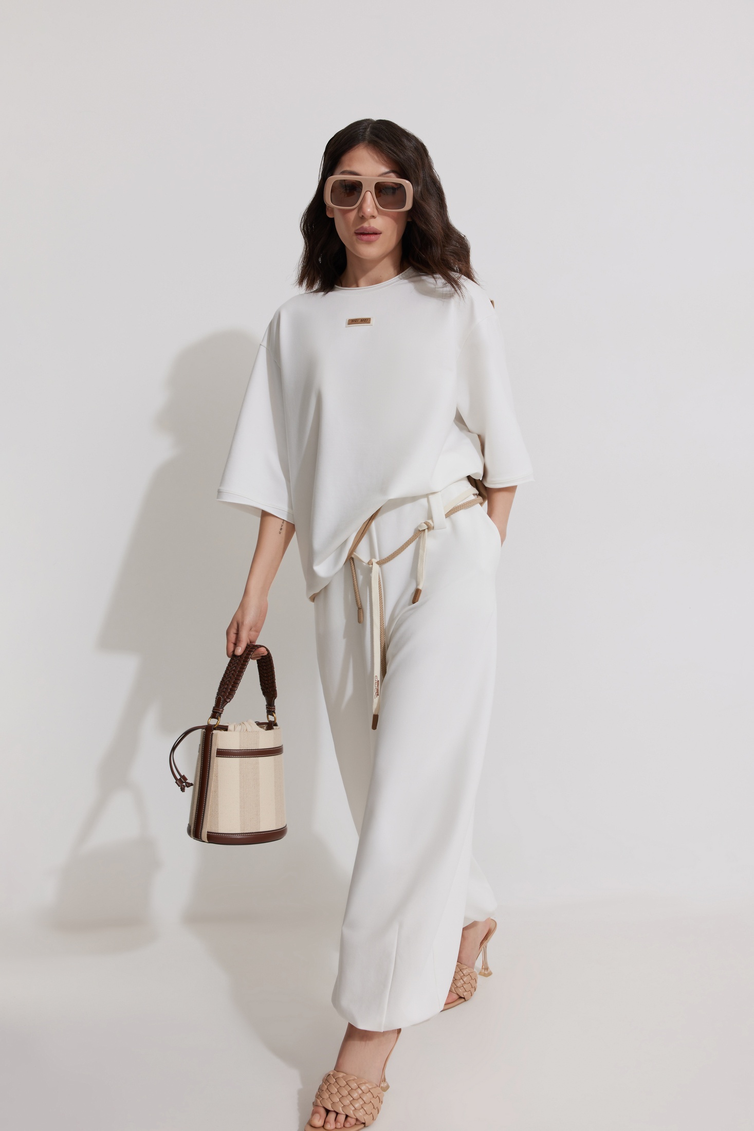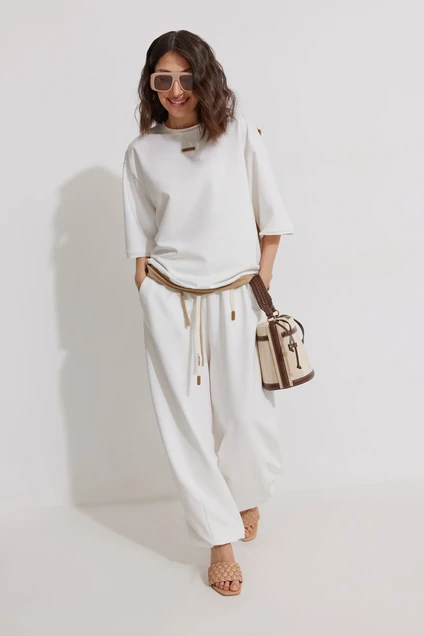 Костюм брючный 1342 ElPaiz — из коллекции бренда ElPaiz. Изготовлен из трикотажного полотна с доминированием хлопка, что делает его мягким и дышащим. Комплект включает оверсайз свитшот с коротким втачным рукавом и свободные брюки с боковыми карманами. Свитшот имеет спущенную линию плеча и круглый вырез горловины, обработанный планкой с открытым срезом, а также двойную спинку с имитацией майки. Брюки прямого силуэта на притачном поясе с резинкой и декоративным поясом. Кулиска по низу позволяет создать эффект 'Алладины'. Подходит для весенне-летнего сезона, отлично смотрится в повседневном стиле. Белый цвет костюма подчеркивает свежесть и легкость образа.