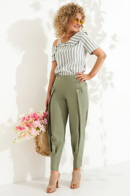 Костюм брючный 617 хаки + полоска Euro Moda — это стильный выбор для повседневного и офисного образа. Коллекция бренда Euro Moda предлагает уникальное сочетание фасонов: асимметричный блузон с открытым плечем и зауженные брюки с декоративными кнопками и складками. Выполнен из 100% полиэстера, что обеспечивает прочность и легкость. Ассиметричный плосколежащий воротник и кнопки на спинке придают комплекту утонченность, а потайная молния на брюках обеспечивает удобство ношения. Короткий рукав делает костюм подходящим для теплого сезона, а цвет хаки в полоску добавляет современный и универсальный акцент к вашему гардеробу.