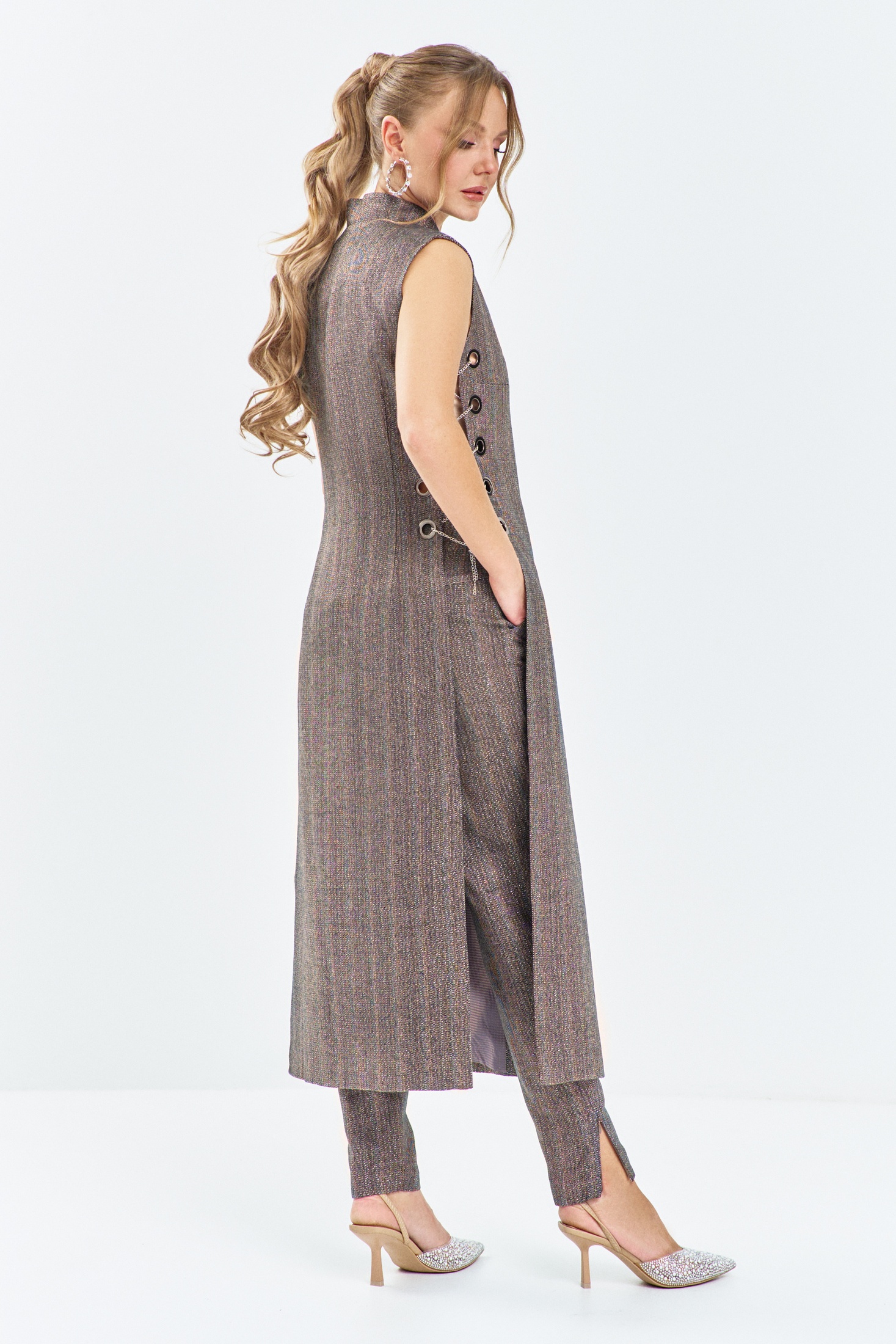 Костюм женский состоит из жилета и брюк, жилет удлинённый с V-образным вырезом и воротником стойкой. Жилет без бочков, с декоративными металлическими люверсами и цепочкой. Брюки зауженные на притачном поясе-кокетке, в боковых швах имеются карманы с бочком. застежка- молния на гульфике, по низу брюк в разрезы вставлены потайные молнии.