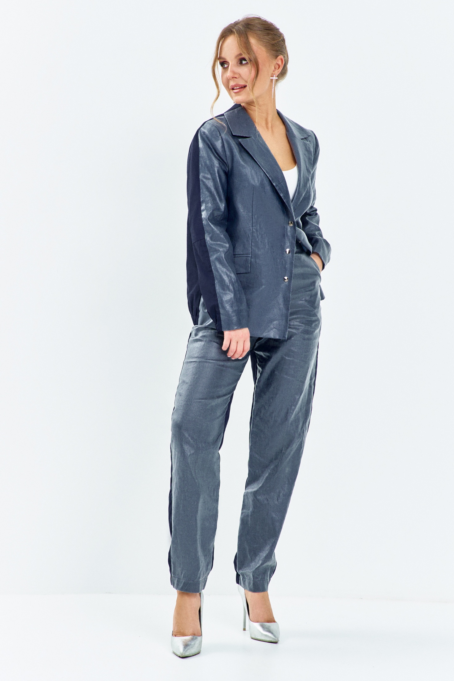 Костюм женский состоит из жакета и брюк, выполнен в сочетании льна с напылением Лаке и болони. Жакет свободного кроя, не приталенный, Полочка жакета выполнена в стиле классического жакета с прорезными карманами - рамками и Английским воротником( отложной воротник с лацканами ). Спинка жакета с отрезной кокеткой , по низу спинки жакета - эластичная тесьма. рукав втачной- длинный, по задней части рукава расположена резинка. Жакет на полной подкладке. Брюки выполнены из сочетания болони и льняной ткани с напылением , изделие на притачном поясе с резинкой, в боковых швах имеются функциональные карманы, застежка- петля- пуговица. по задней части брюк снизу эластичная тесьма.