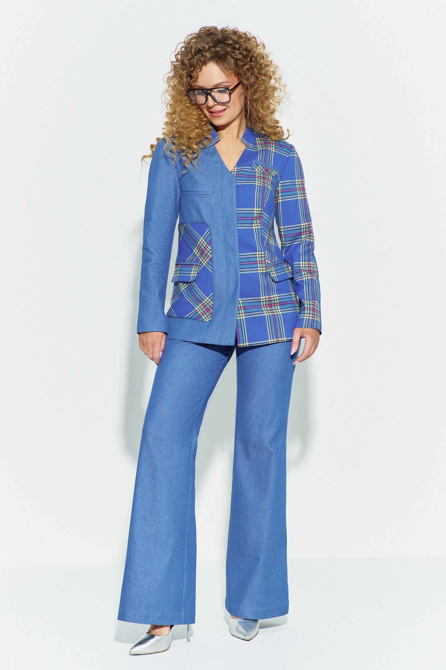 Костюм брючный 696 от Euro Moda — стильное сочетание функциональности и элегантности. Коллекция бренда представлена в современном классическом стиле, идеально подходящем для деловых встреч и повседневной активности. Изготовлен из комфортных тканей — джинса и костюмной ткани, что обеспечивает долговечность и удобство в эксплуатации. Жакет с плоско лежащим воротником-стойкой и потайной застежкой на петли-пуговицы создает лаконичный образ. Декоративные детализированные карманы придают изюминку, а классические брюки с клешем создают изящный силуэт. Голубой цвет добавляет свежести и стиля. Надежные карманы и высококачественная подкладка делают костюм идеальным вариантом для весеннего и летнего сезонов.