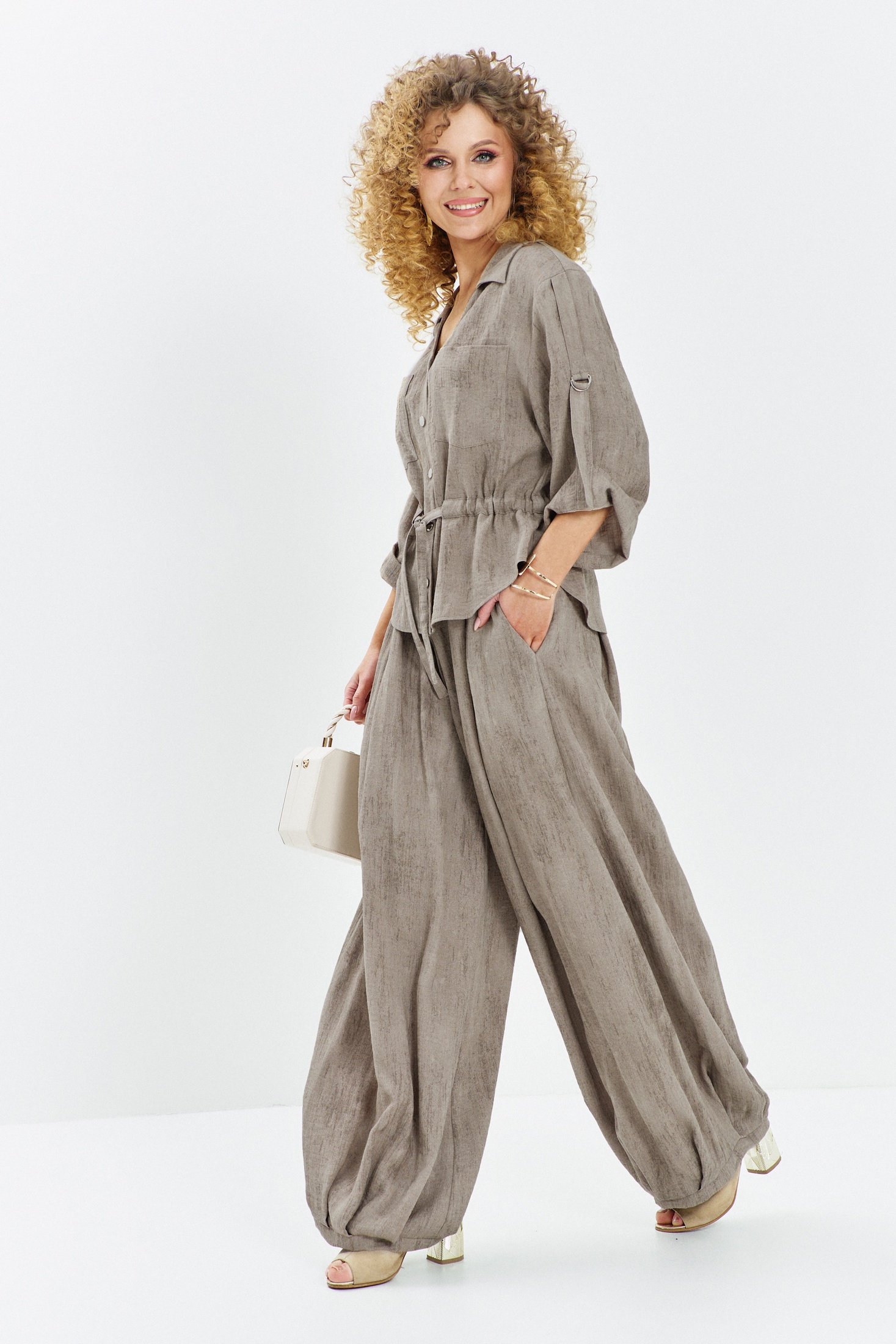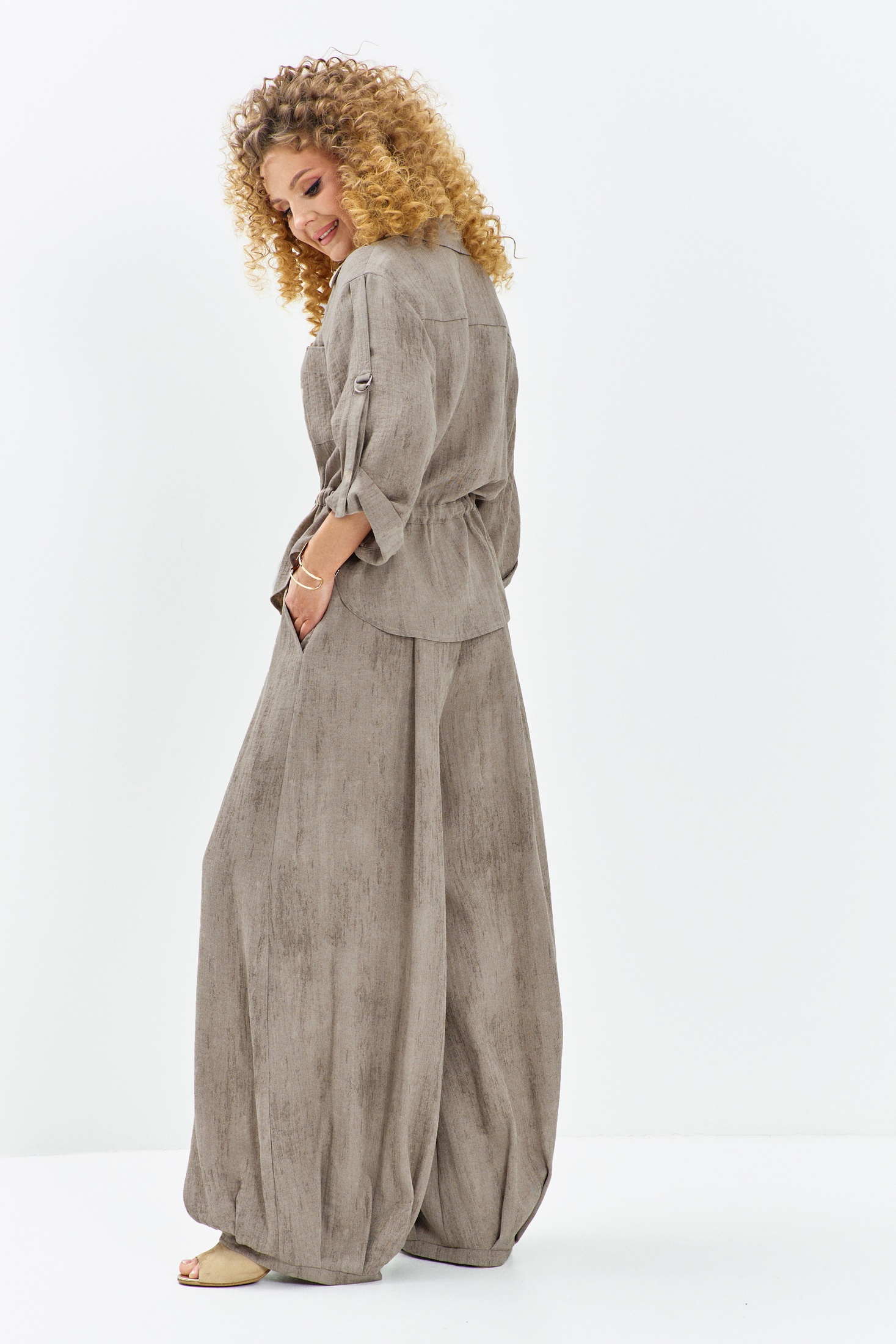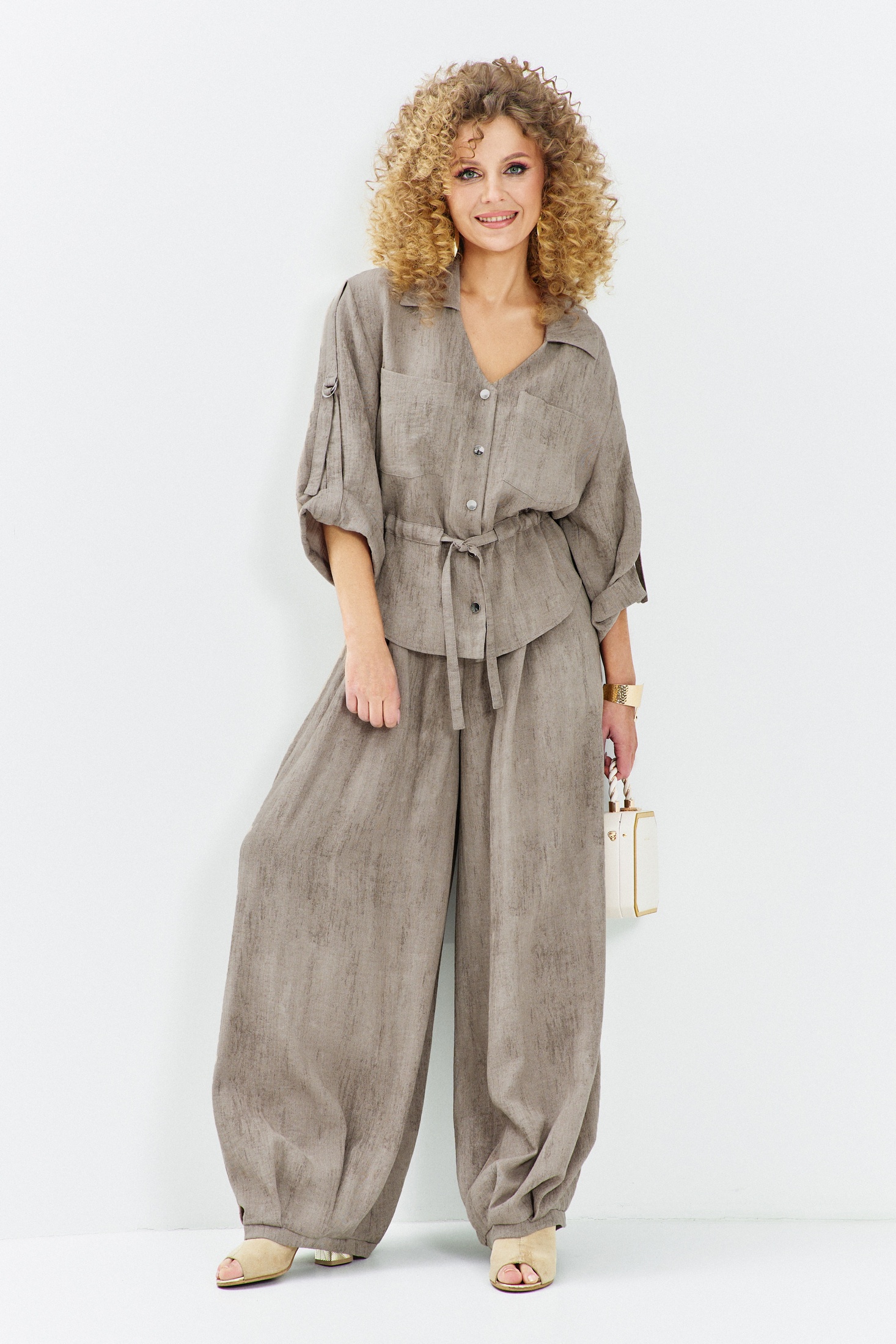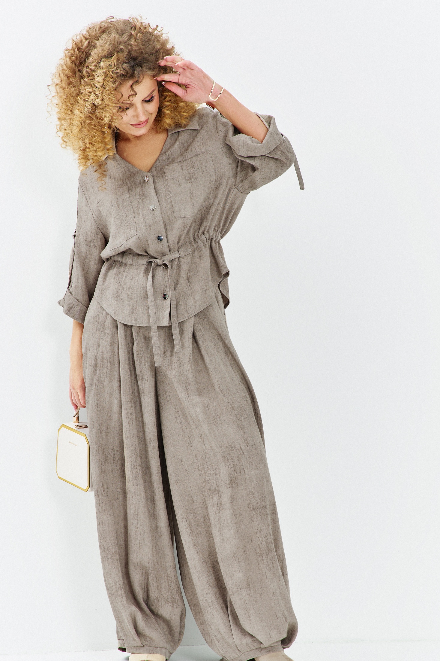Костюм брючный 716 бежевый меланж Euro Moda — это стильная двойка, состоящая из блузона и брюк-шаровар. Коллекция бренда Euro Moda предлагает изделия из ткани, имитирующей натуральный лен, с меланжевым эффектом. Блузон оформлен V-образным вырезом, отложным воротником и накладными карманами. Мягкий пояс-кулиска позволяет варьировать силуэт, придавая образу уют и легкость, благодаря патам на рукавах. Брюки-шаровары с высокой посадкой созданы для максимального удобства, оснащены молнией и карманами в боковых швах. Они впечатляют своим объемом и создают эффект летящей юбки при ходьбе. Этот костюм идеально подходит для весенне-летнего сезона и станет прекрасным выбором для прогулок и отдыха, благодаря своему бежевому цвету и комфортному фасону.