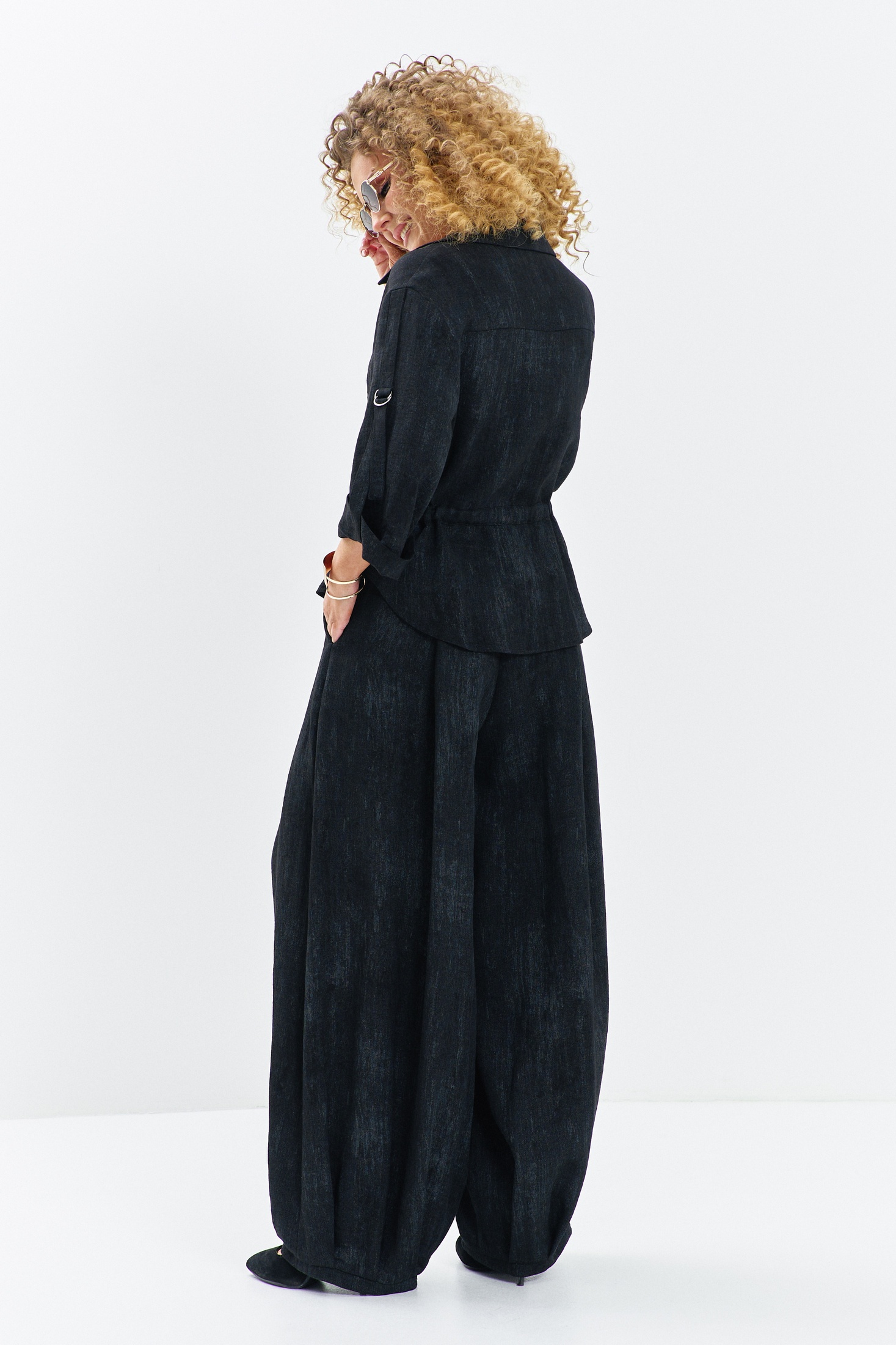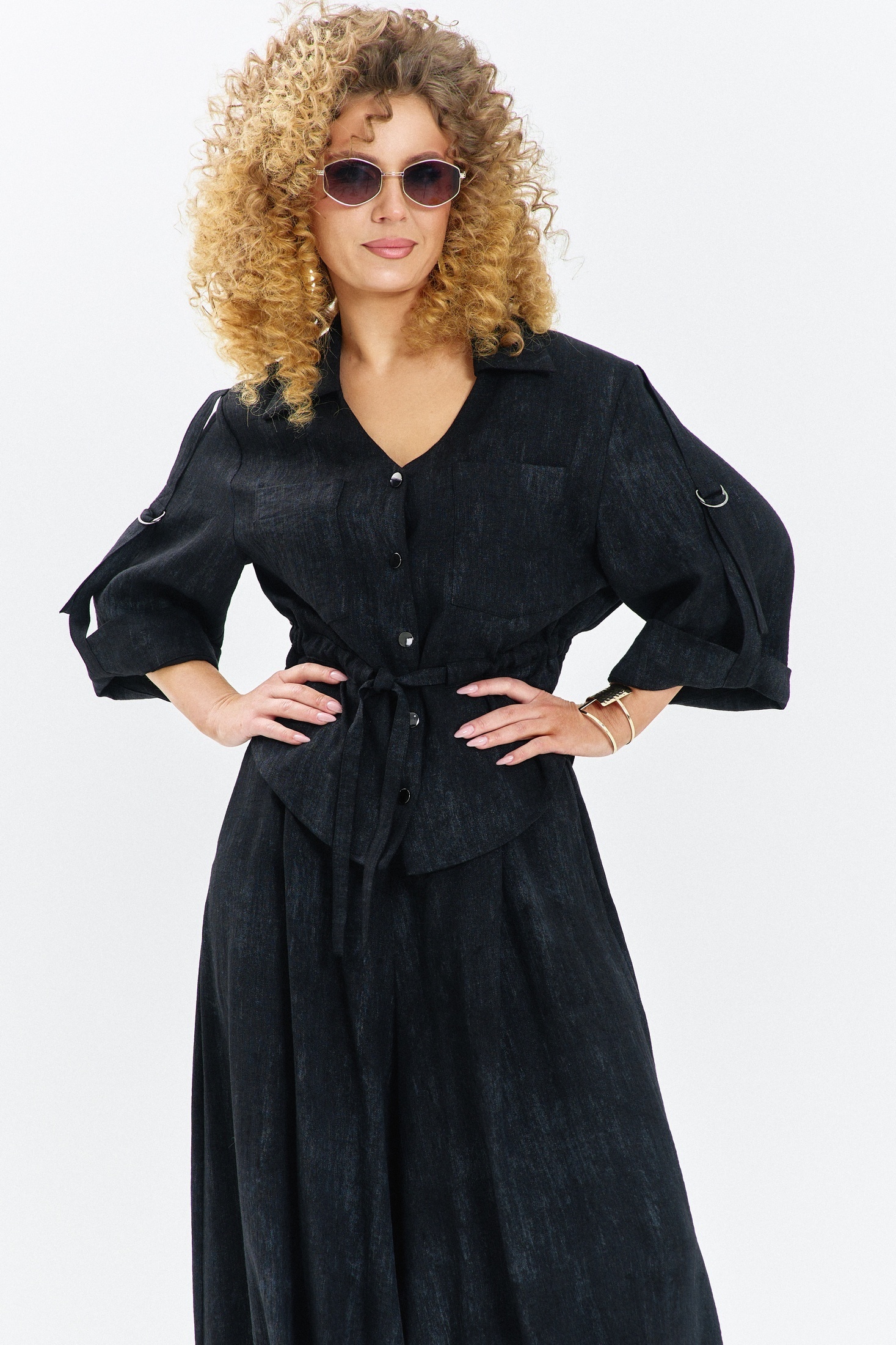 Костюм брючный 716 черный меланж Euro Moda – стильное решение для современной женщины. Коллекция бренда Euro Moda предлагает вам обновить гардероб с учетом последних модных тенденций. Этот двухкомплектный костюм включает в себя блузон и брюки-шаровары. Изделие выполнено из ткани с эффектом меланж, которая визуально напоминает натуральный лен, благодаря сочетанию вискозы и нейлона. Блузон с V-образным вырезом и отложным воротником, дополнен накладными карманами и застежкой на кнопки. Мягкий пояс-кулиска позволяет регулировать посадку, придавая образу утонченность. Брюки-шаровары с высокой посадкой и широкими штанинами создают эффект легкой юбки при ходьбе. Модель оснащена функциональными боковыми карманами и застежкой-молнией. Костюм идеально подходит для весенне-летнего сезона и будет уместен как в офисе, так и на отдыхе. Черный цвет добавляет универсальности и легкости в сочетаниях.