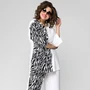 Комплект женский двухпердметный, состоящий из блузы и брюк, выполнен из двух видов ткани. Блуза свободного прямого силуэта, длиной ниже линии бедра. По переду средний шов, в боковых швах обработаны разрезы, по спинке V-образный вырез горловины, не глубокий, который фиксируется пряжкой и хлястиком из отделочной ткани. Брюки палаццо, пояс на резинке, в боковых швах карманы.