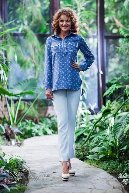 Костюм женский состоящий из блузки и брюк. Блуза удлиненная, спинка длиннее переда. Длина по спинке 78см. , длина по переду блузки 74см. По полочке блузы расположена функциональная планка и нагрудные карманы с клапанами, выделенные декоративным кантом. Воротник на стойке. Рукав втачной с узкой манжетой по низу рукава и патами, Длина рукава 60 см.  По спинке блузы имеется отрезная кокетка, декорированная кантом. Низ блузы обработан обтачками. Брюки на притачном поясе с широкой резинкой по кругу. Брюки средней посадки, зауженные к низу. Длина брюк по боковому шву  100см.