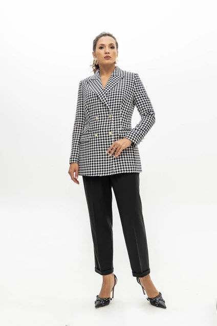 Костюм из приталенного жакета черно-белой гусь-лапки может стать базой и для офисного образа, если сочетать с брюками-бананами (слоучи). подкладка:поливискоза жаккард (55% ПЭ 45% вискоза)