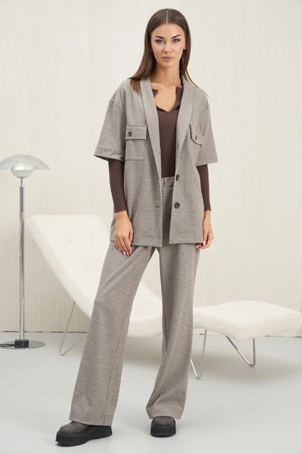 Свободный силуэт, покрой втачной, на заниженной линии плеча, застёжка центральная, воротник - шалевый, (м.б. стойка). Полочки с накладными карманами с клапаном. Рукав до локтя. Брюки в расслабленном стиле, на эластичном поясе с наклонными боковыми карманами.