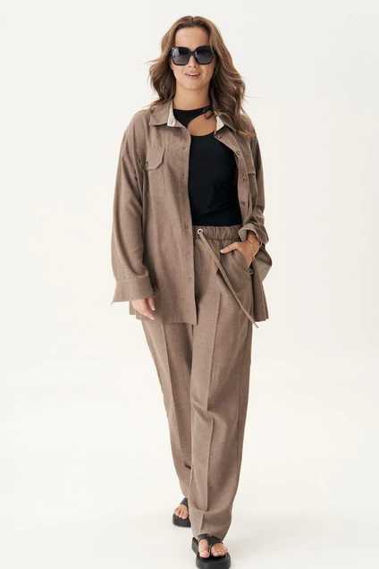 Брюки свободные, с наклонными боковыми карманами, мягкими складками по передним половинкам и эластичным поясом с люверсами и декоративным шнуром.