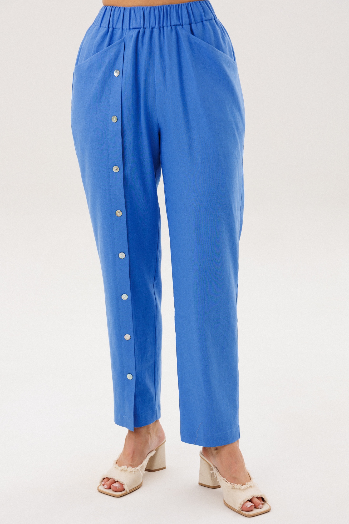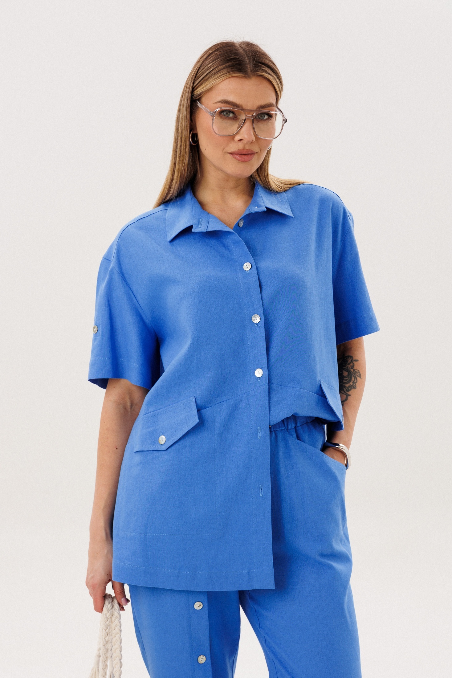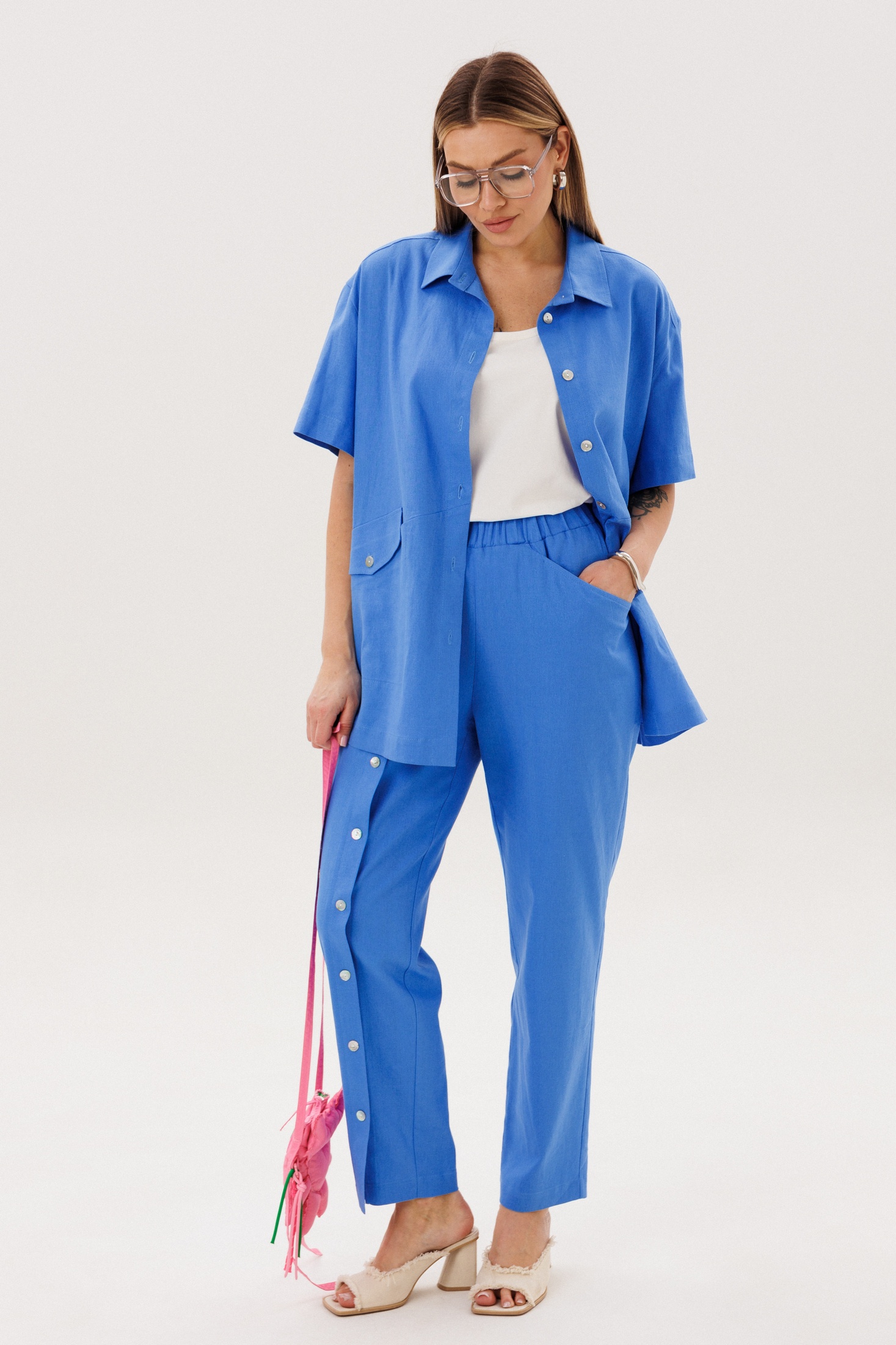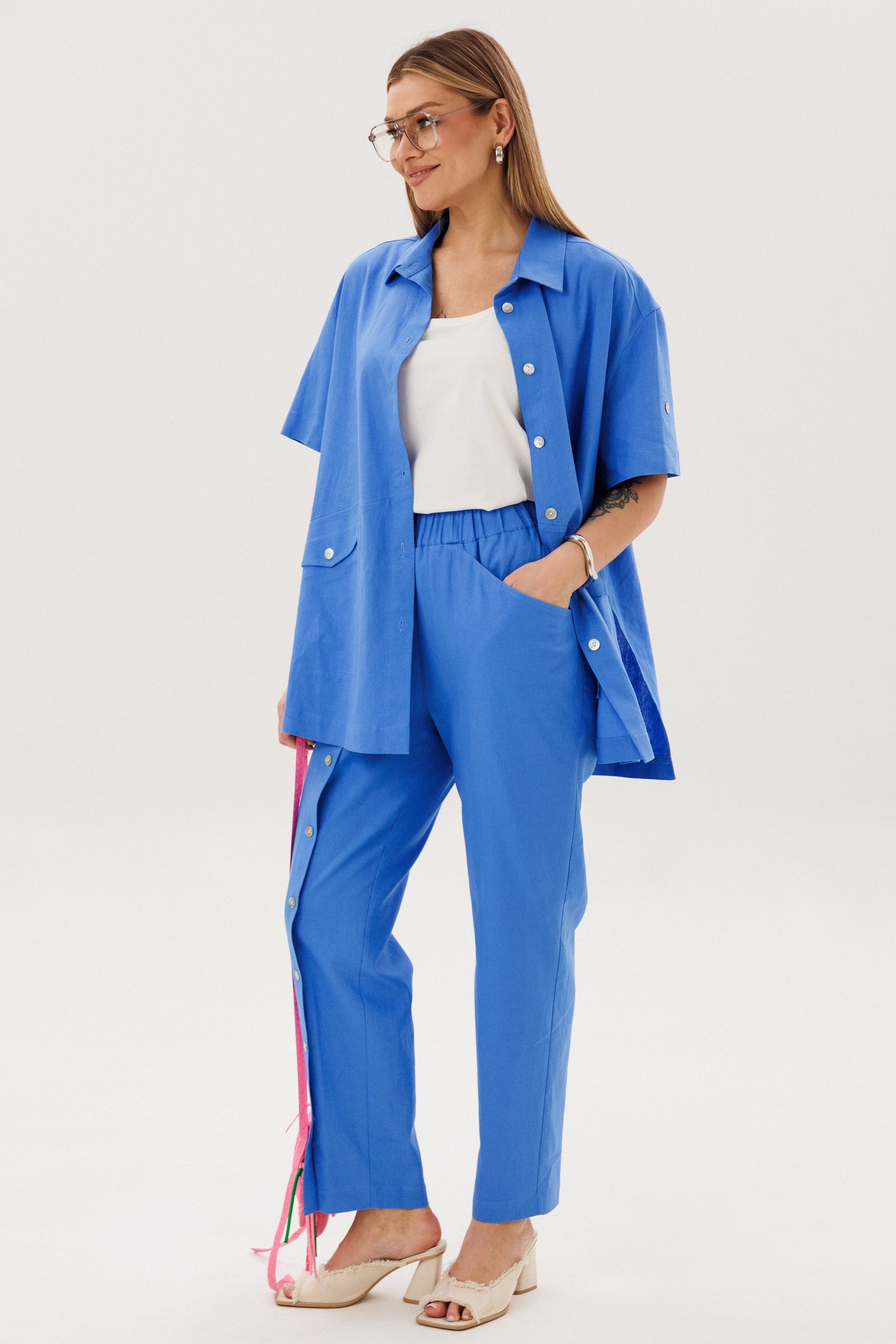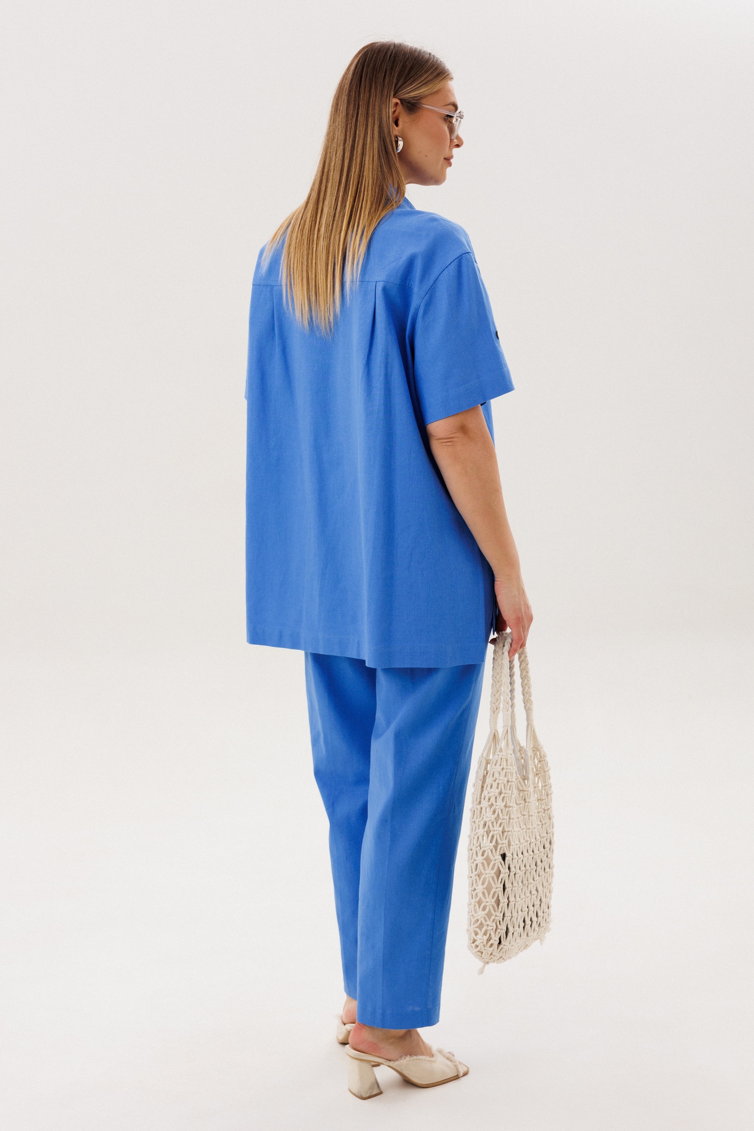 Костюм брючный 4815-1 FantaziaMod — идеальное решение для летнего гардероба. Коллекция бренда FantaziaMod предлагает стильный и комфортный комплект из льна и вискозы. Лён обеспечивает легкость и дышащие свойства, а вискоза добавляет мягкость. Брючный костюм отличается свободной рубашкой с классическим вортником и центральной застёжкой, дополненной карманом с клапаном и спинкой с отрезной кокеткой и мягкими складками. Брюки слегка заужены к низу, с эластичным поясом и наклонными карманами. Обратите внимание на стильные разрезы в боковых швах рубашки и сквозную шлицу на брюках. Толстые кнопки делают акцент на деталях. Длина брюк около 102 см, рубашки — 77 см, рукав — 20 см. Светло-синий цвет костюма подчеркивает его универсальность для повседневного гардероба.