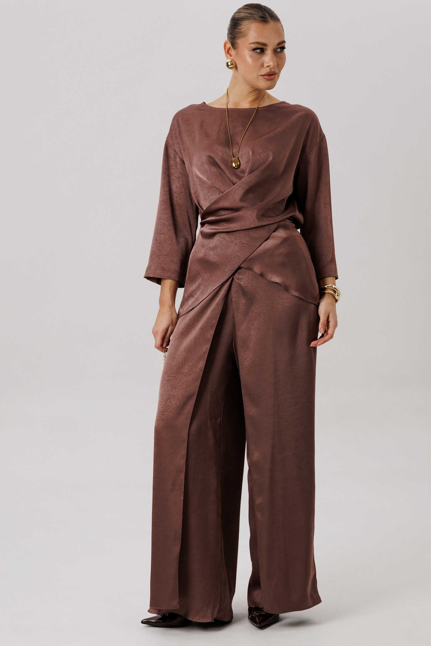Невероятная блуза из одноимённой ткани завершает образ, превращая его в платье или даже комбинезон.