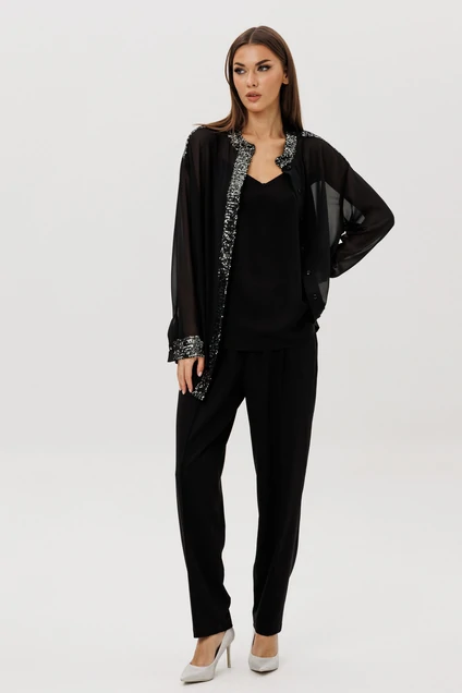 Лёгкая шифоновая блуза свободного покроя украшена изысканной отделкой пайетками по линии борта и манжетам, создавая тонкий блеск и игру света в движении. Атласный топ на регулируемых бретелях добавляет мягкого женственного сияния и комфортно садится по фигуре. Брюки из поливискозного полотна со стрелками и эластичным поясом завершают образ, сочетая удобство и безупречный силуэт.