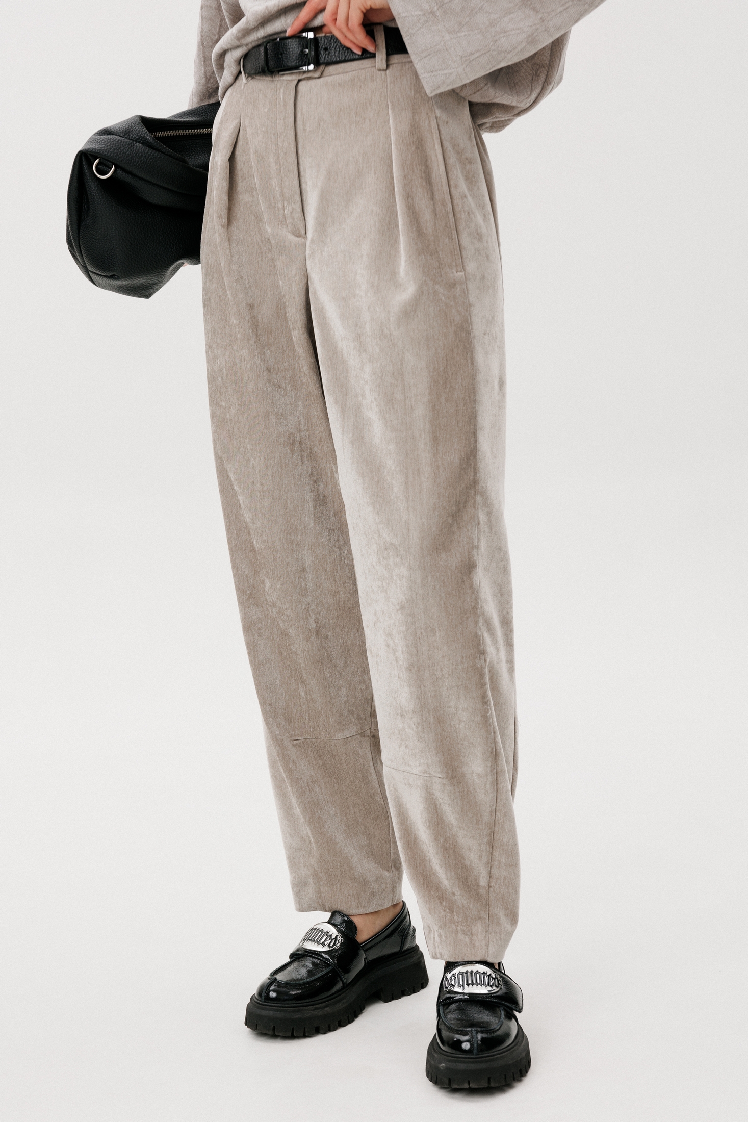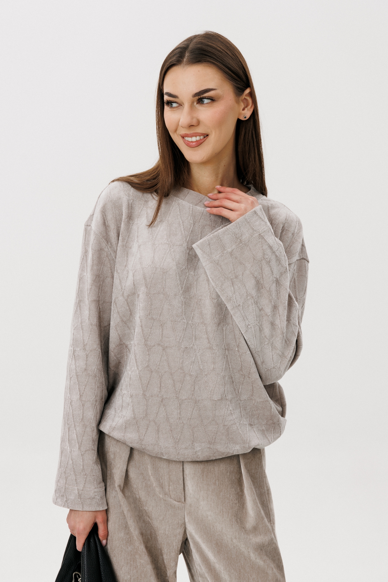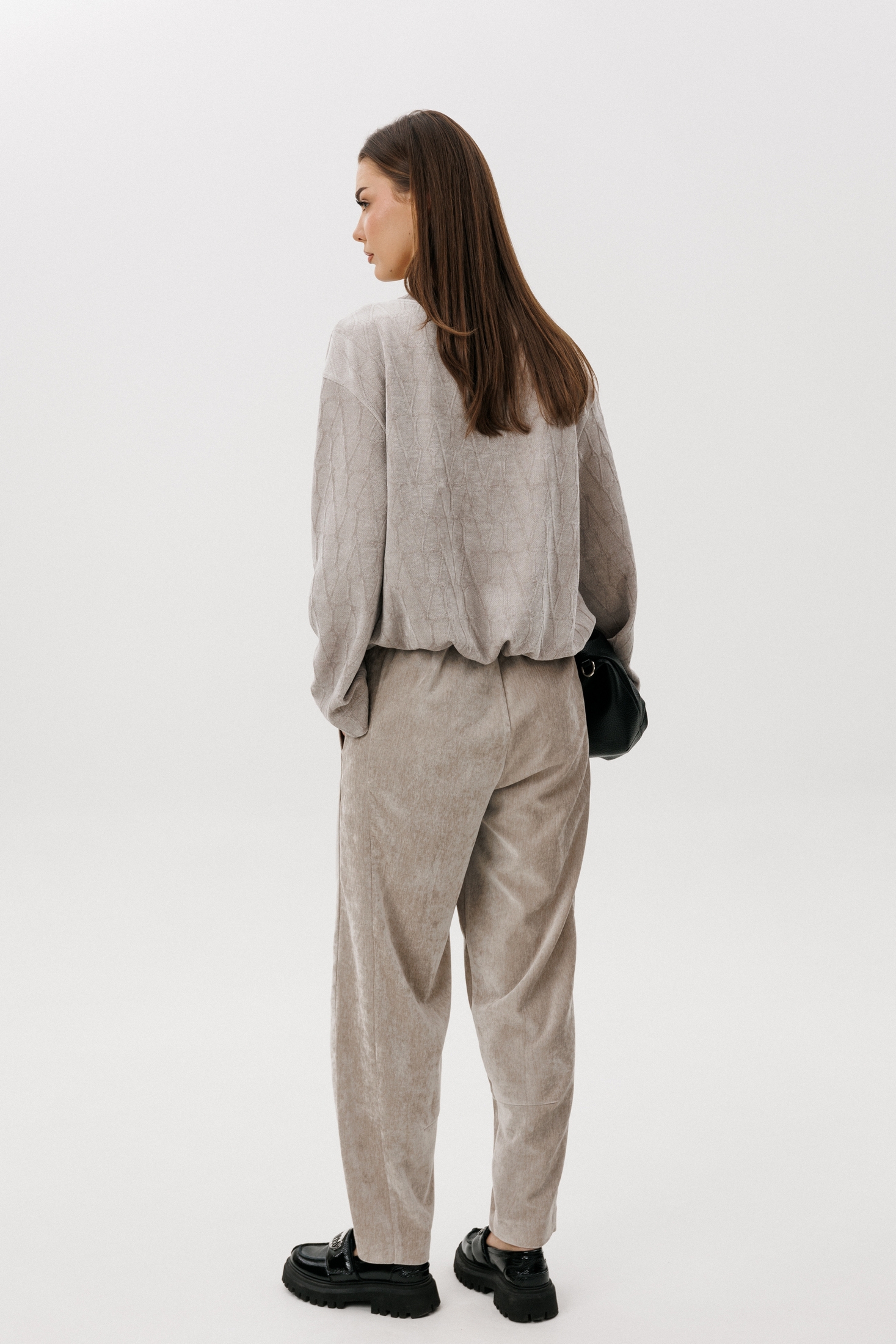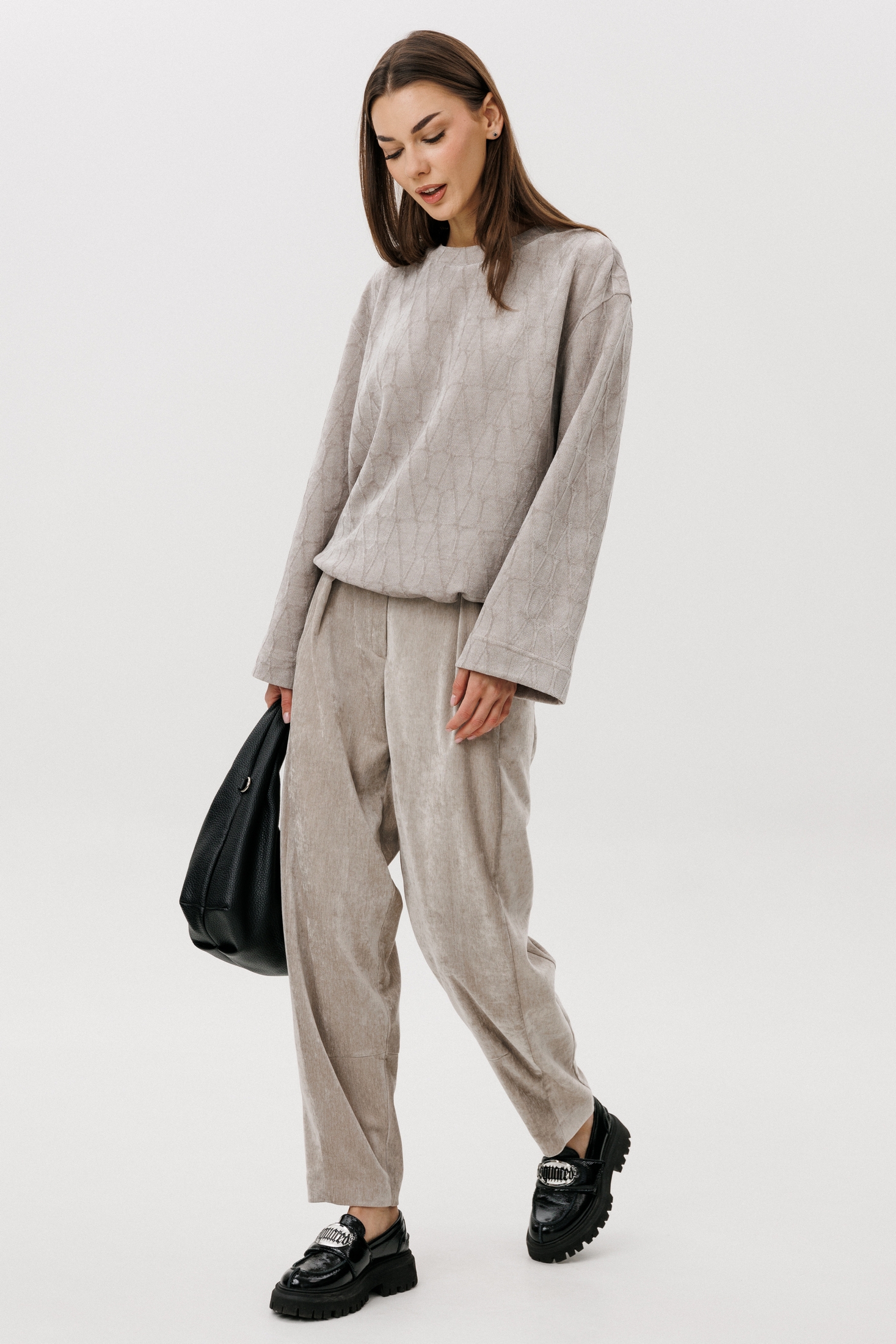Свободный джемпер расширенного силуэта втачного покроя на заниженной линии плеча. Рукав расширенный в области оката. По низу джемпера шнур- резинка с фиксаторами. Брюки ""баррел"" на притачном поясе со шлёвками (эластичном в области спинки), с наклонными карманами , мягкими складками защипами по верху брюк.