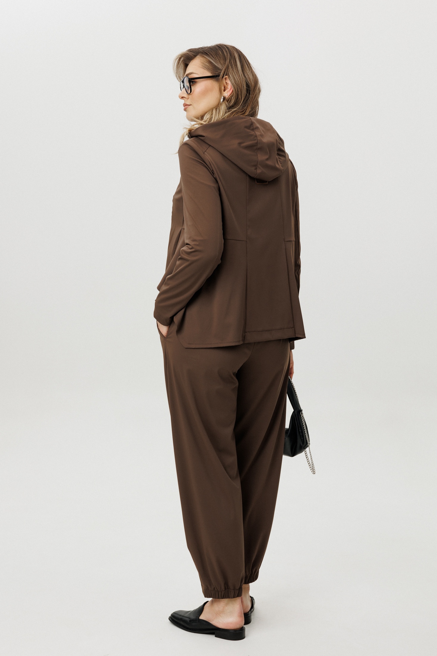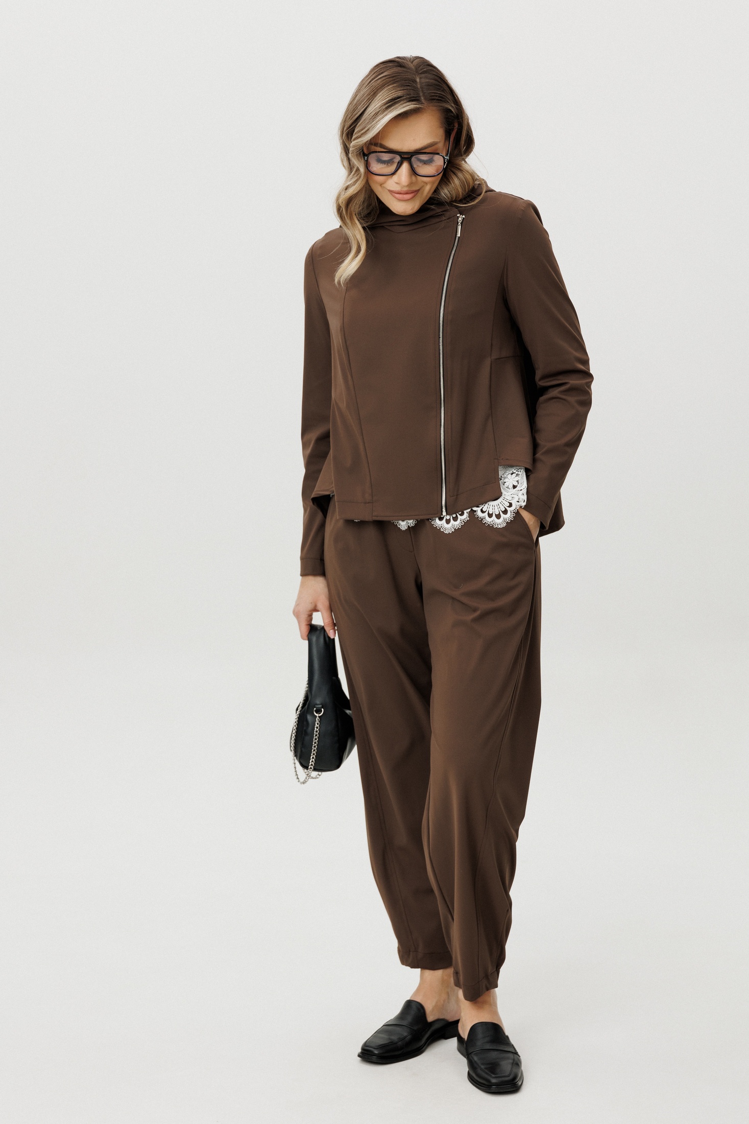 Костюм брючный 5370 шоколад FantaziaMod — это стильное решение для современной женщины. Коллекция бренда FantaziaMod сочетает в себе архитектурный крой и комфорт. Выполненный из трикотажного полотна с эластаном, костюм обеспечивает мягкость и плоскую структуру, создавая расслабленный, но собранный образ. Куртка с капюшоном и асимметричной молнией подчеркивает динамичность и уникальность дизайна. Хлопчатобумажный топ с кружевным краем добавляет женственности. Брюки с эластичным поясом и эффектными подрезами обеспечивают идеальную посадку и свободу движений. Шоколадный цвет и минималистичный стиль делают комплект универсальным для городского гардероба, подходящим для любого сезона.