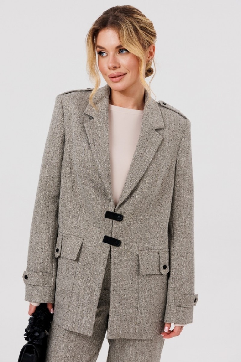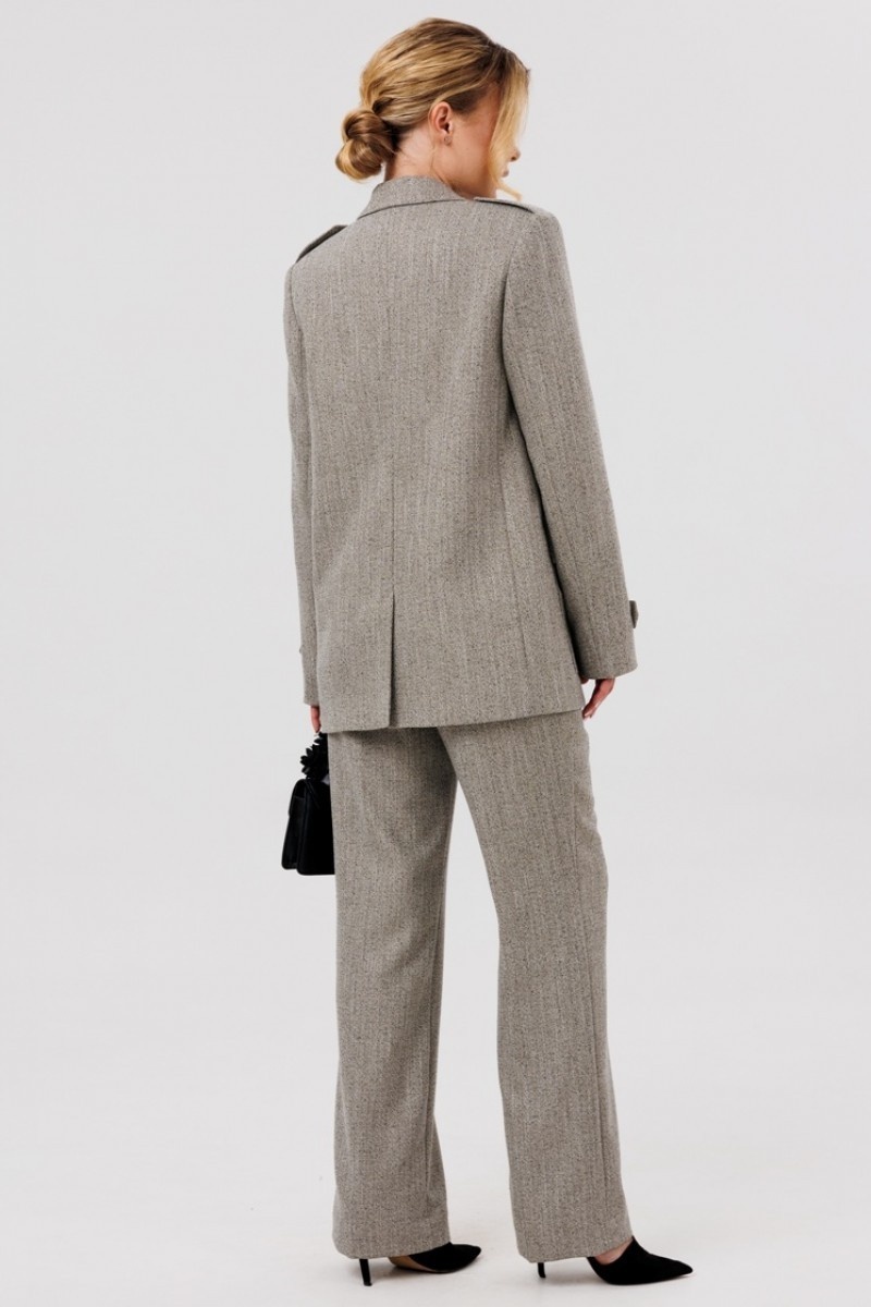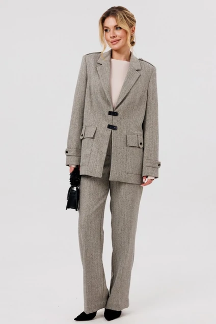 Элегантный брючный костюм серого цвета представляет собой идеальный выбор для современного делового стиля. Костюм выполнен из качественной костюмной ткани, обеспечивающей комфорт и изысканность на протяжении всего дня. Жакет прямого кроя на подкладке с V-образным вырезом и классическими лацканами дополнен практичными планками с черными пуговицами и карманами с клапанами, придавая образу аккуратность и структурированность. Брюки в комплекте имеют прямой слегка зауженный к низу крой, что делает силуэт более стройным и подчеркивает линии ног. Пояс по спинке выполнен на удобной резинке, обеспечивая идеальную посадку и комфорт при носке. Такой костюм будет отличным выбором как для офисных встреч, так и для деловых мероприятий.