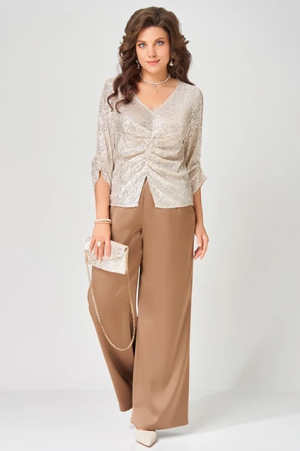 "Зария" — сияющий образ для особенных вечеров. Блузка, расшитая пайетками, ловит свет и восхищённые взгляды, а сатиновые брюки добавляют элегантности и свободы движения. Идеальный выбор для новогодней ночи, корпоративов и торжеств, где хочется блистать.