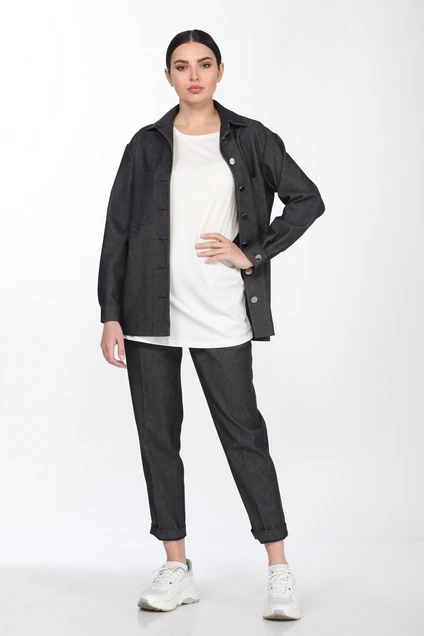 Костюм городского стиля, состоящий из жакета, брюк и майки. Жакет и брюки выполнены из джинса. Жакет прямого силуэта со втачными рукавами, отложным воротником, по переду застежка на петли и пуговицы и накладные карманы, рукава на манжетах. Брюки полуприлегающего силуэта в спортивном стиле на обтачке со шлевками для ремня, в боковых швах карманы. Майка удлиненная прямая со втачными рукавами.