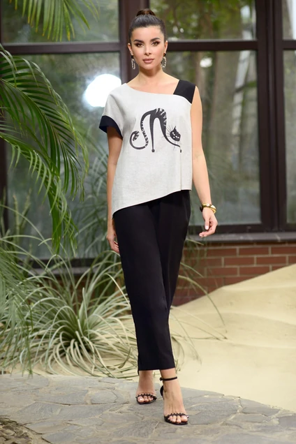 Комплект женский, выполненный из льняной ткани, в сочетании двух цветов. Блуза прямая ассиметричная, с бретелей из отделочной ткани на левой части изделия и с цельнокроенным рукавом с манжетой из отделочной ткани. Низ блузы разноуровневый, выполнен в форме острых углов и разрезов с одной стороны. Брюки прямые, зауженные к низу, укороченные. По низу в боковых швах небольшие разрезы. По переду по центру имитация застежки. Задняя часть пояса регулируется резинкой. Карманы-около боковых швов с отрезным бочком.