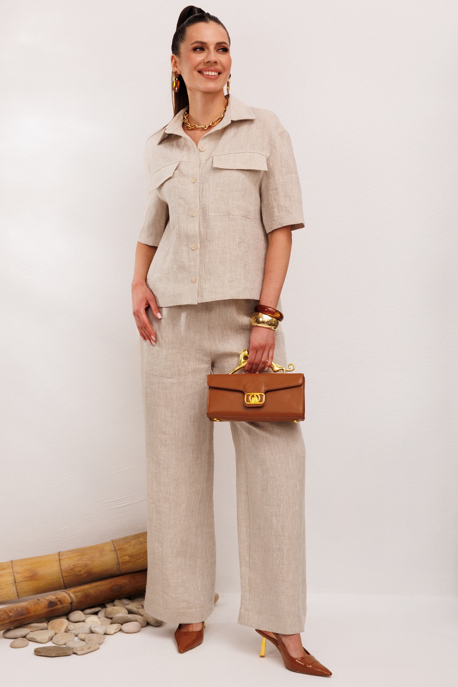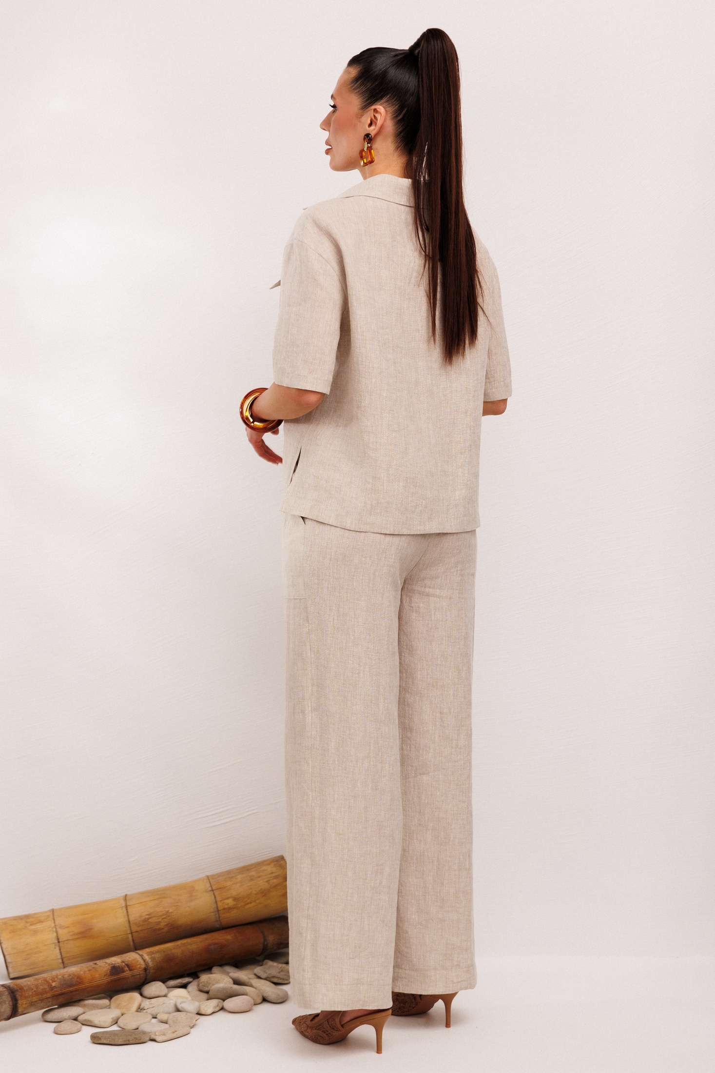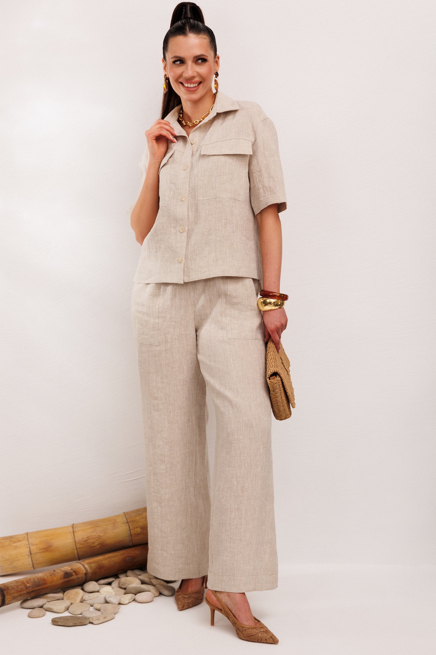 Костюм брючный 982-1 бежевый Галеан Стиль — это идеальное воплощение комфорта и стиля для летних дней. Коллекция бренда Галеан Стиль представляет льняной костюм-двойку, состоящий из рубашки и брюк. Материал — 100% лён, который дарит лёгкость и воздушность в жаркую погоду. Рубашка имеет прямой силуэт с воротником стойкой и застёжкой на пуговицы, дополнена накладными карманами. Брюки прямого кроя с резинкой по талии оснащены удобными накладными карманами и декоративным шнурком. Благодаря большой подгибке, их длина подходит для любого роста. Бежевый цвет добавляет элемент элегантности, а натуралистический стиль делает этот костюм универсальным выбором для повседневных и прогулочных мероприятий.