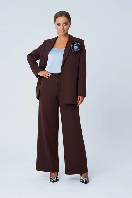 Костюм состоит из жакета и брюк выполнных из костюмной ткани и топа из атласной ткани. Жакет полуприлегающего силуэта из костюмной ткани с воротником пиджачного типа. Застежка однобортная на одну пуговицу. Перед и спинка с рельефами из проймы. По спинке средний шов. Рукав втачной двухшовный. Жакет на подкладке. Брюки расширеные книзу с притачным поясом из костюмной ткани. В поясе по бокам вставлена резинка. По передней и задней частям брюк вытачки. Спереди застежка гульфик на молнии и пуговицей на поясе. Фурнитура может быть изменена с сохранением художественного образа. Топ прямого силуэта на регулируемых бретелях. спинка с резинкой по верху. Длина жакета - 72 см, длина рукава - 61 см, длина топа - 45 см, длина брюк по боковому шву без учета пояса - 106 см.