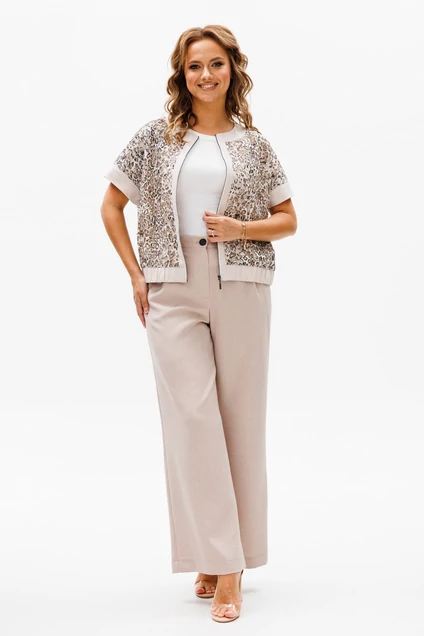 Костюм состоит из бомбера и брюк. Бомбер прямого силуэта, по низу собран на резинку. Бомбер выполнен из кружевной ткани на подкладке и отделочной ткани по периметру. Застежка центральная на молнию. Рукав цельнокроеный коротнкий с манжетой понизу. Брюки расширенные книзу с притачным поясом. В боковых частях пояса вставлены резинки. По передней и задней частям брюк вытачки. По переду застежка на молнию и гульфик и петлю и пуговицу на поясе. Длина бомбера - 54 см, длина плеча - 32 см, длина брюк - 107 см.