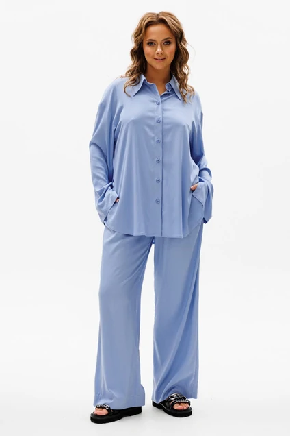 Костюм состоит из блузки топа и брюк выполненых из вискозной ткани. Блузка прямого силуэта с центральной застежкой на петли и пуговицы. Воротник отложной на стойке. Рукав рубашечного покроя одношовный со шлицей по низу шва. По боковым швам разрезы. Низ фигурный. Топ прямого силуэта с нагрудными вытачками и регулируемыми бретелями. Брюки прямые с цельнокроеным поясом на резинке. В боковых швах карманы, по переду имитация застежки гульфика. Длина блузки - 75см, длина рукава - 56 см, длина топа - 35 см, длина брюк - 108 см.