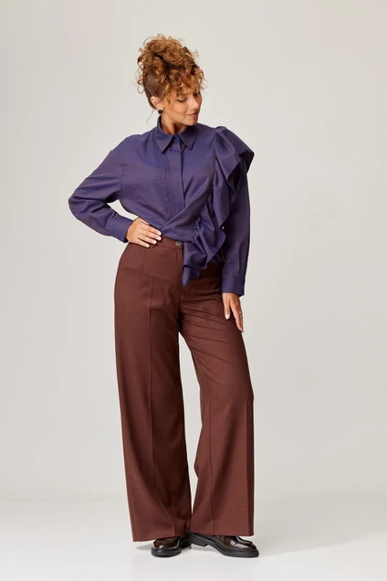 Костюм состоит из блузки (рубашки) и брюк. Рубашка прямого силуэта выполнена из хлопковой ткани с оригинальным жаккардовым переплетением. Перед с центральной застежкой потайной планкой. Левая часть переда и спинка с воланом на сборке вставленном в рельеф. На правой части переда настрочен карман. Рукав втачной одношовный с манжетой по низу. на манжете застежка на 2 петли и пуговицы. Воротник отложной со стойкой. Брюки расширеные книзу с притачным поясом выполнены из костюмной ткани средней плотности. В поясе по бокам вставлена резинка. По передней и задней частям брюк вытачки и заутюжены стрелки. Спереди застежка гульфик на молнии и пуговицей на поясе. Фурнитура может быть изменена с сохранением художественного образа. Длина рубашки - 65 см, длина рукавав рубашки - 53 см. Длина брюк по боковому шву без учета пояса- 106 см.