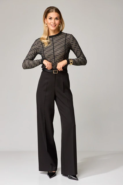 Костюм состоит из джемпера и брюк. Джемпер прилегающего силуэта выполнен из трикотажной ткани сверху с сеткой. По переду и по спинке на сетке выполнены декоративные рельефы. Горловина округлой формы обработана довязом. Рукав втачной с довязом понизу. Брюки расширеные книзу с притачным поясом. Спереди застежка гульфик на молнии и петлей и пуговицей по поясу. По задней частям брюк вытачки. Пояс срезинкой в боковых частях. Брюки с заутюженными стрелками. Длина джемпера: 60 см, длина рукава джемпера 60 см, длина брюк с учетом пояса - 109 см. Брюки: ПЭ 97%, спандекс 3%