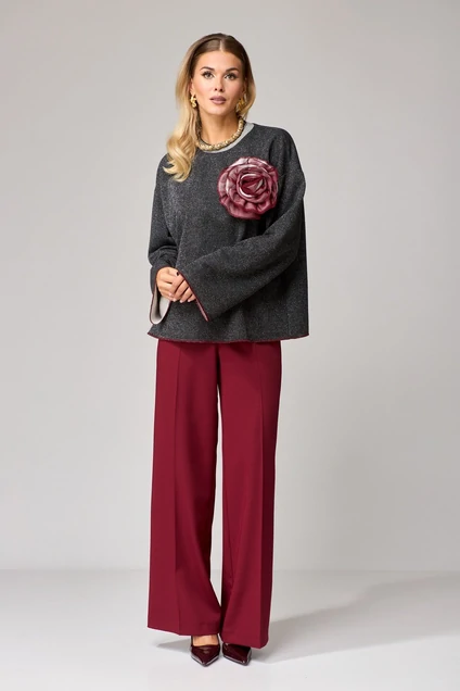 Костюм состоит из джемпера и брюк. Джемпер свободного силуэта выполнен из трикотажной ткани с люрексом. Горловина округлой формы обработана довязом. Рукав втачной со спущенным плечом. Низ рукава и низ изделия обработаны декоративной строчкой. К джемперу прилагается съемное декоративное украшение цветок. Брюки расширеные книзу с притачным поясом. Спереди застежка гульфик на молнии и петлей и пуговицей по поясу. По задней частям брюк вытачки. Пояс срезинкой в боковых частях. Брюки с заутюженными стрелками. Длина джемпера: 64 см, длина рукава джемпера 54 см, длина брюк с учетом пояса - 109 см. Брюки: ПЭ 97%, спандекс 3%.