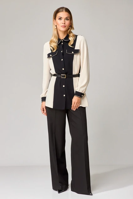 Костюм состоит из блузки и брюк. Блузка прямого силуэта из плательной ткани 2-х цветов. По переду центральная застежка. Воротник со стойкой. Перед с рельефами и декоративными клапанами. Рукав втачной одношовный. Низ рукава собран на манжету с застежкой на петлю и пуговицу. По клапану, воротнику и манжете настрочена отделочная тесьма. Спинка, манжеты, воротник, внутренние части переда выполнены из ткани черного цвета. К блузке прилагается ремень из кожзама с металлической пряжкой. Брюки расширеные книзу с притачным поясом. Спереди застежка гульфик на молнии и петлей и пуговицей по поясу. По задней частям брюк вытачки. Пояс срезинкой в боковых частях. Брюки с заутюженными стрелками. Фурнитура может быть изменена с сохранением художественного образа. Длина блузки: 73 см, длина рукава: 61 см. Длина брюк: 109 с учетом пояса. Брюки: ПЭ -97%, спандекс -3%
